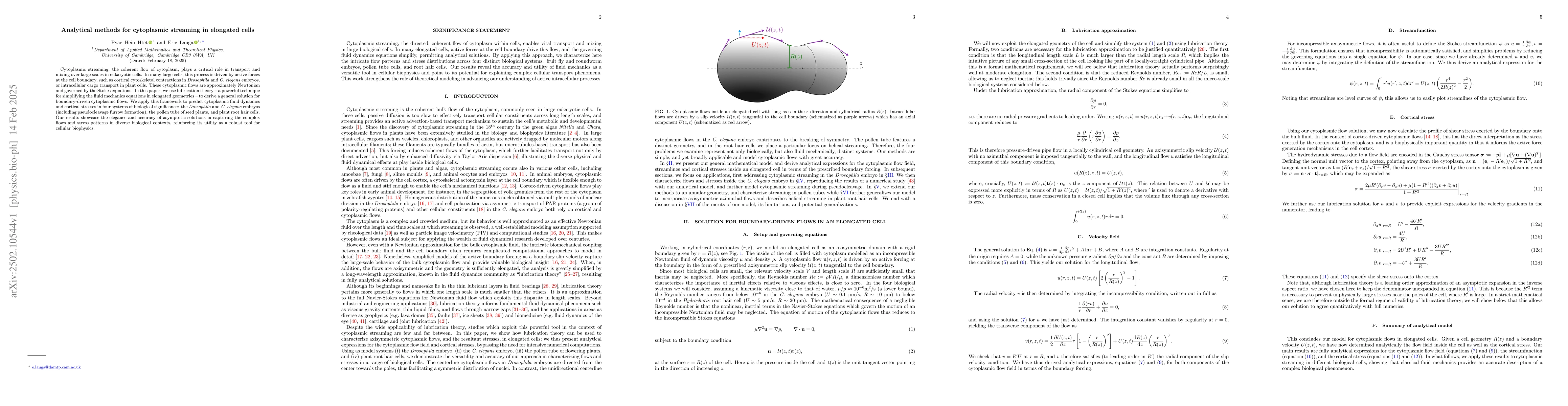 This paper employs lubrication theory to derive solutions for boundary-driven cytoplasmic streaming in elongated cells, applying the method to Drosophila and C. elegans embryos, pollen tubes, and plant root hair cells to predict fluid dynamics and cortical stresses, demonstrating the technique's effectiveness in capturing complex cellular flows.