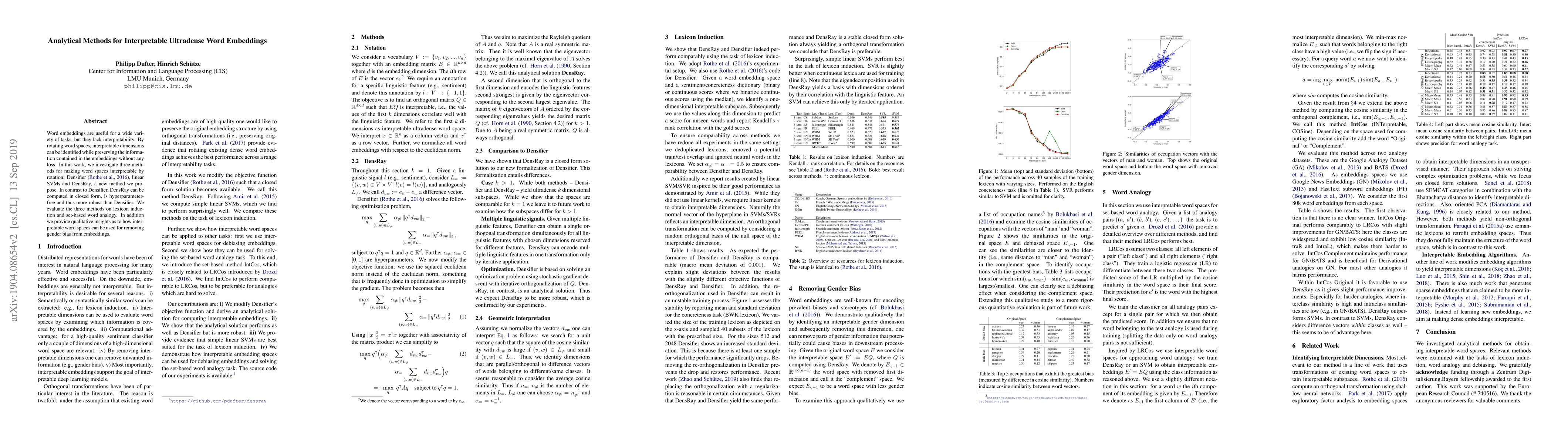 This paper explores three methods—Densifier, linear SVMs, and the new DensRay—for making ultradense word embeddings interpretable through rotation. DensRay, in particular, offers closed-form computation, hyperparameter-free robustness, and is evaluated for lexicon induction and word analogy tasks, with qualitative insights on reducing gender bias.