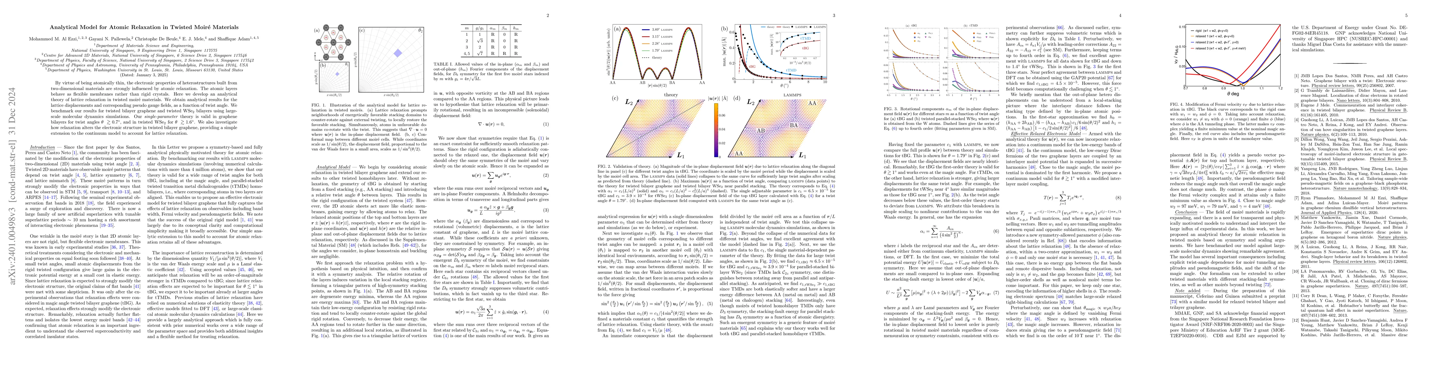 The paper develops an analytical model to describe lattice relaxation in twisted moiré materials, predicting lattice displacements and pseudo gauge fields dependent on twist angle. The model is validated against molecular dynamics simulations for twisted bilayer graphene and WSe$_2$, showing applicability for twist angles above 1° in graphene and 4° in WSe$_2$.