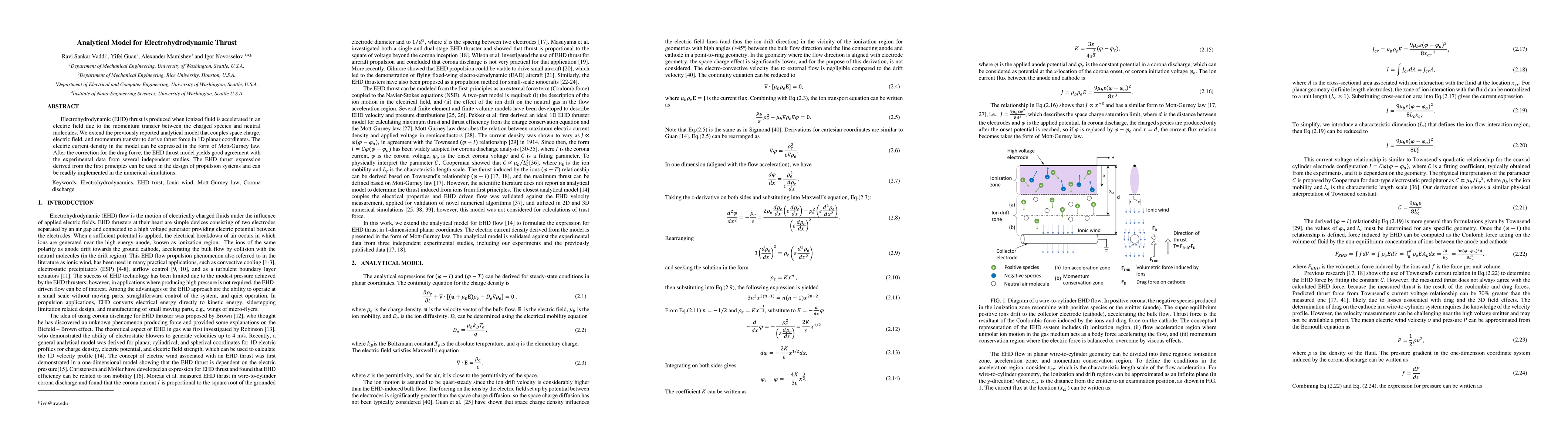 Electrohydrodynamic (EHD) thrust is produced when ionized fluid is accelerated in an electric field due to the momentum transfer between the charged species and neutral molecules. We extend the previously reported analytical model that couples space charge, electric field, and momentum transfer to derive thrust force in 1D planar coordinates. The electric current density in the model can be expressed in the form of Mott-Gurney law. After the correction for the drag force, the EHD thrust model yields good agreement with the experimental data from several independent studies. The EHD thrust expression derived from the first principles can be used in the design of propulsion systems and can be readily implemented in the numerical simulations.