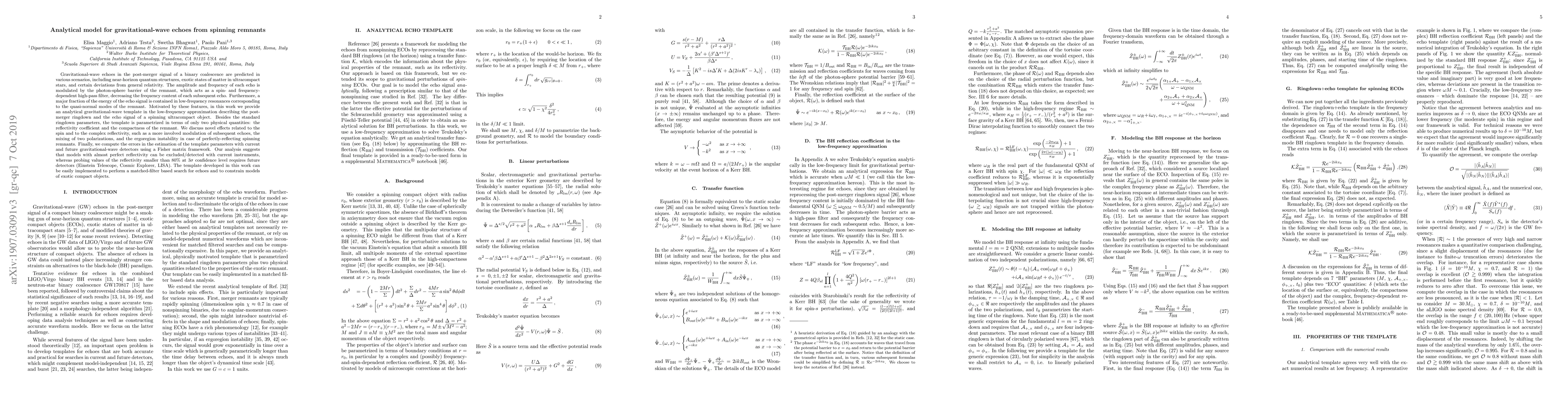 This paper develops an analytical model for gravitational-wave echoes from spinning remnants post-merger, focusing on the low-frequency approximation. The model describes the ringdown and echo signals, parametrized by reflectivity and compactness, and predicts novel effects like modulation and polarization mixing. It also estimates detection capabilities for current and future detectors, suggesting that future instruments are needed to probe reflectivity below 80%.