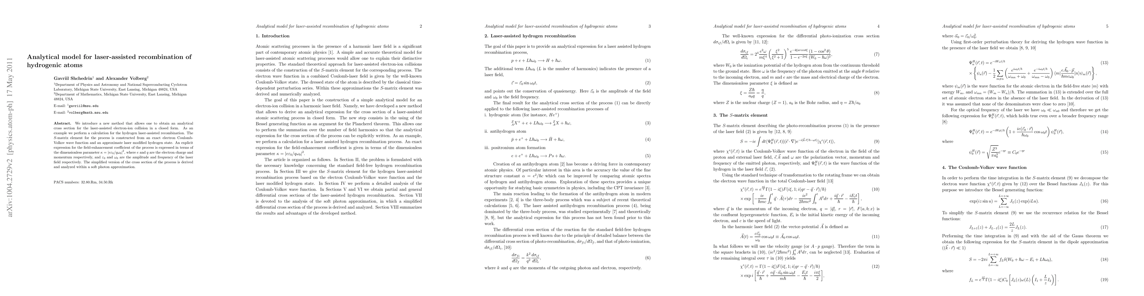 This paper presents an analytical model for laser-assisted recombination of hydrogenic atoms, providing a closed-form expression for the cross section using an exact electron Coulomb-Volkov wave function and an approximate laser-modified hydrogen state. The model includes a field-enhancement coefficient expressed in terms of a dimensionless parameter and is analyzed under a soft photon approximation.