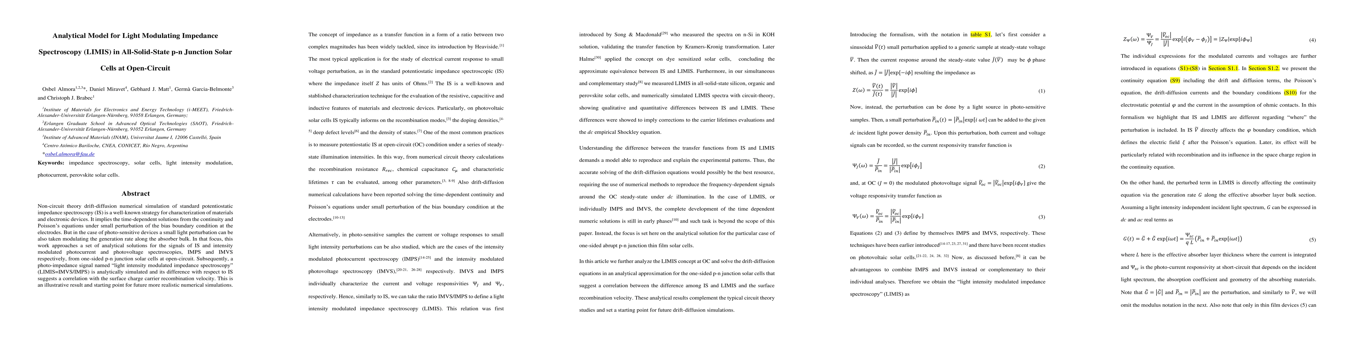 This paper develops an analytical model for Light Modulating Impedance Spectroscopy (LIMIS) in all-solid-state p-n junction solar cells at open-circuit, showing how LIMIS correlates with the surface charge carrier recombination velocity. The model provides a foundation for future detailed numerical simulations.
