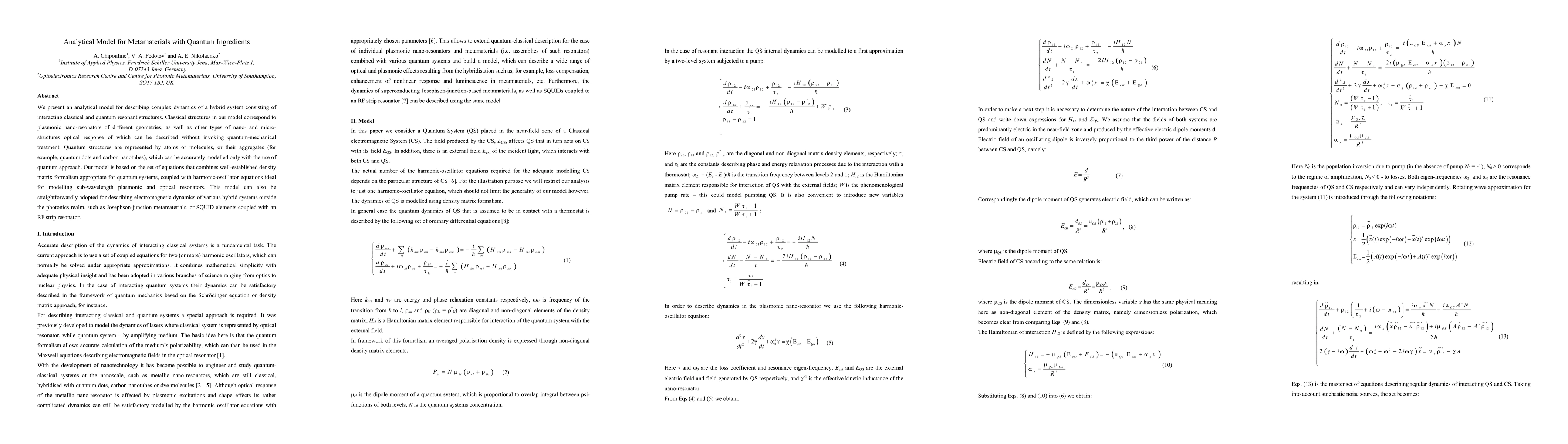 We present an analytical model for describing complex dynamics of a hybrid system consisting of interacting classical and quantum resonant structures. Classical structures in our model correspond to plasmonic nano-resonators of different geometries, as well as other types of nano- and micro-structures optical response of which can be described without invoking quantum-mechanical treatment. Quantum structures are represented by atoms or molecules, or their aggregates (for example, quantum dots and carbon nanotubes), which can be accurately modelled only with the use of quantum approach. Our model is based on the set of equations that combines well-established density matrix formalism appropriate for quantum systems, coupled with harmonic-oscillator equations ideal for modelling sub-wavelength plasmonic and optical resonators. This model can also be straightforwardly adopted for describing electromagnetic dynamics of various hybrid systems outside the photonics realm, such as Josephson-junction metamaterials, or SQUID elements coupled with an RF strip resonator.