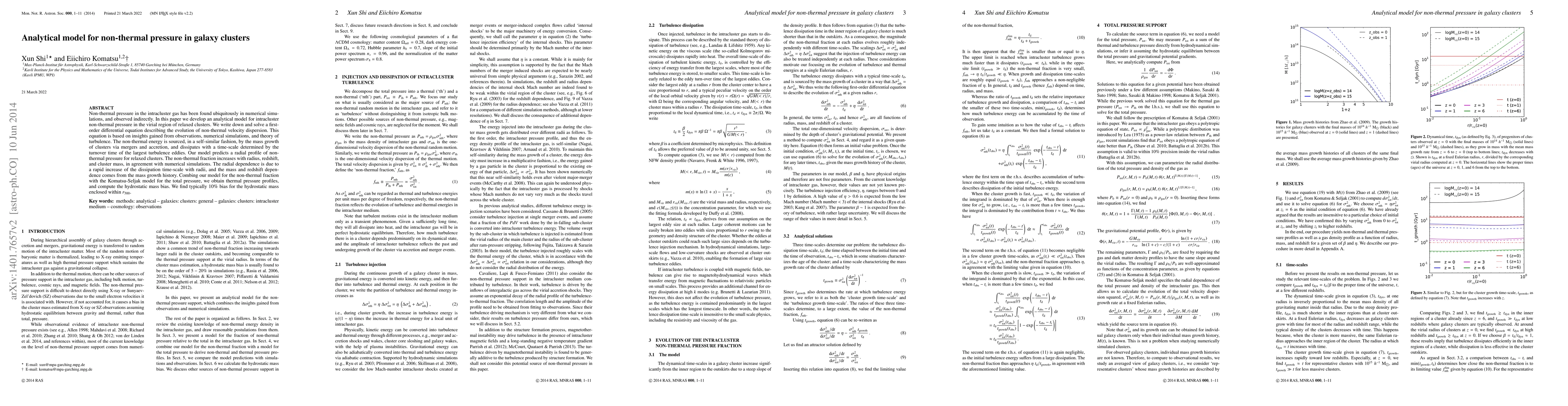 This paper develops an analytical model for non-thermal pressure in galaxy clusters, predicting its radial profile and dependence on cluster mass and redshift. The model combines non-thermal and thermal pressure profiles to compute hydrostatic mass bias, finding a typical 10% bias within $r_{500}$.