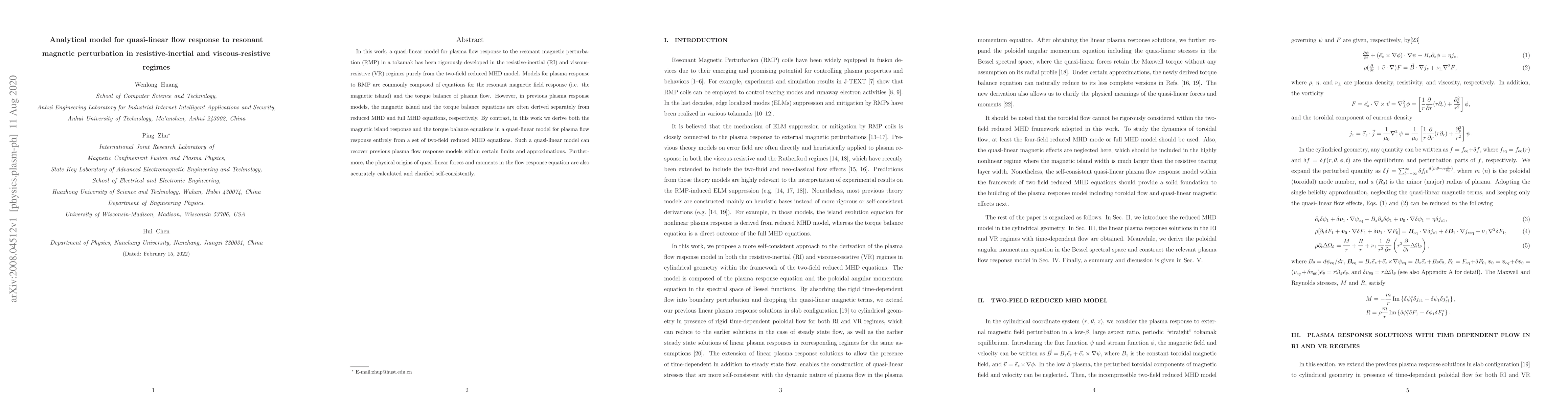 This paper develops a quasi-linear model for plasma flow response to resonant magnetic perturbations in tokamak resistive-inertial and viscous-resistive regimes, deriving both magnetic island and torque balance equations from a two-field reduced MHD model. The model provides a self-consistent calculation of quasi-linear forces and moments in plasma flow response.
