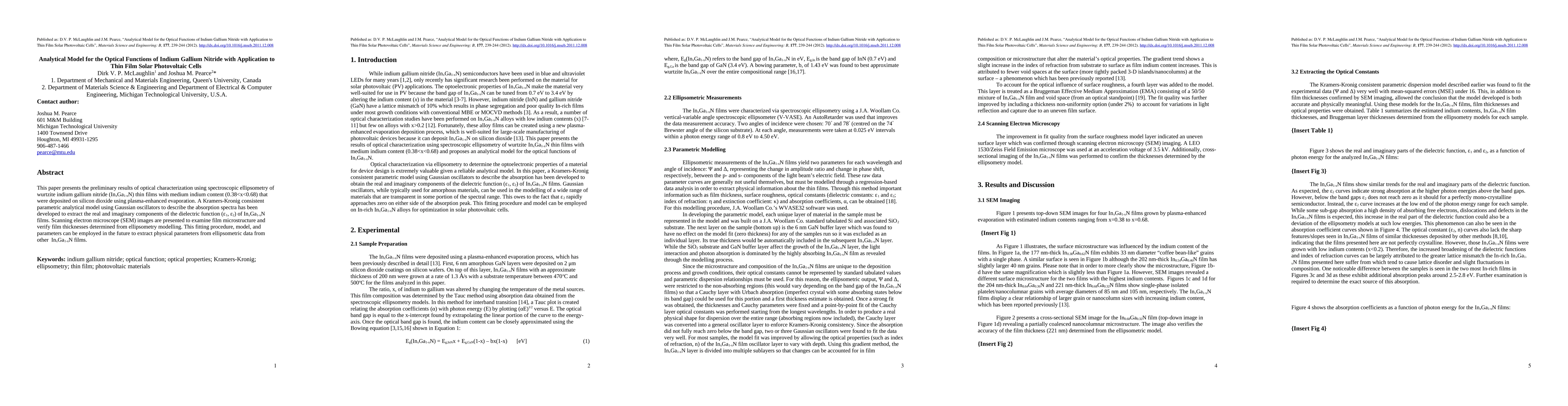 This paper develops an analytical model for the optical properties of InxGa1-xN thin films, using spectroscopic ellipsometry and Gaussian oscillators to extract dielectric function components. The model can be applied to future analysis of similar films, aiding in the development of thin film solar photovoltaic cells.