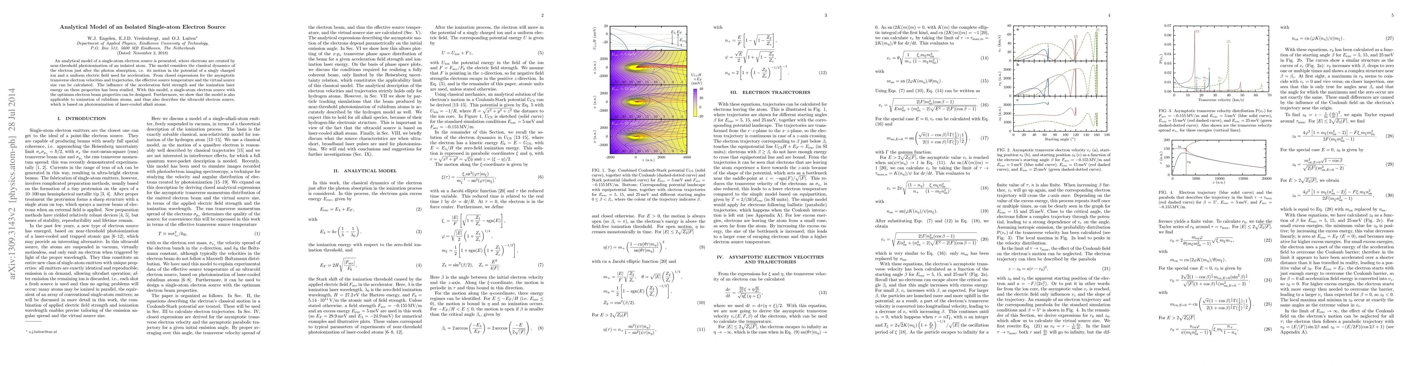 An analytical model of a single-atom electron source is presented, where electrons are created by near-threshold photoionization of an isolated atom. The model considers the classical dynamics of the electron just after the photon absorption, i.e. its motion in the potential of a singly charged ion and a uniform electric field used for acceleration. From closed expressions for the asymptotic transverse electron velocities and trajectories, the effective source temperature and the effective source size can be calculated. The influence of the acceleration field strength and the ionization laser energy on these properties has been studied. With this model, a single-atom electron source with the optimum electron beam properties can be designed. Furthermore, we show that the model is also applicable to ionization of rubidium atoms, thus also describes the ultracold electron source, which is based on photoionization of laser-cooled alkali atoms.
