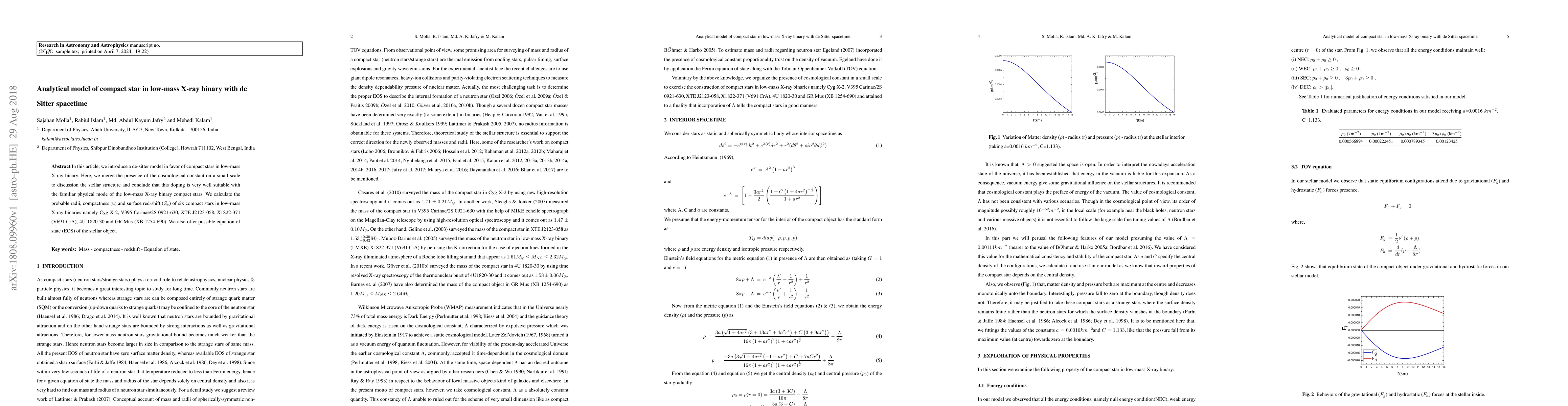 In this article, we introduce a de-sitter model in favor of compact stars in low-mass X-ray binary. Here, we merge the presence of the cosmological constant on a small scale to discussion the stellar structure and conclude that this doping is very well suitable with the familiar physical mode of the low-mass X-ray binary compact stars. We calculate the probable radii, compactness (u) and surface red-shift (Zs) of six compact stars in low-mass X-ray binaries namely Cyg X-2, V395 Carinae/2S 0921-630, XTE J2123-058, X1822-371 (V691 CrA), 4U 1820-30 and GR Mus (XB 1254-690). We also offer possible equation of state (EOS) of the stellar object.