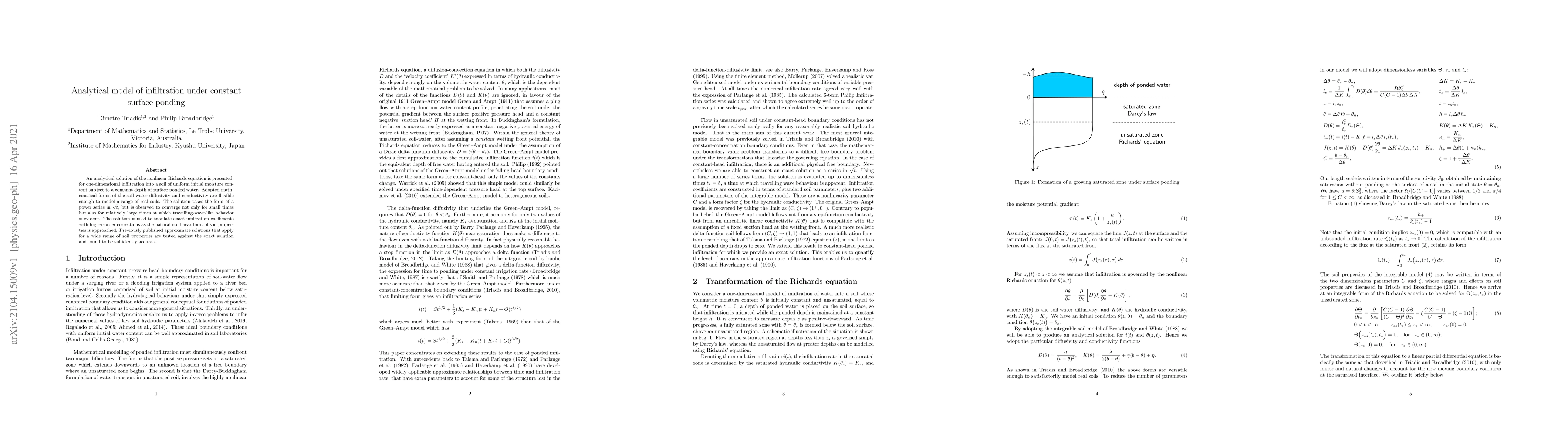 Researchers developed an analytical model for infiltration under constant surface ponding, providing a more accurate solution than previous approximations, and found that their model can capture the behavior of various real soils.