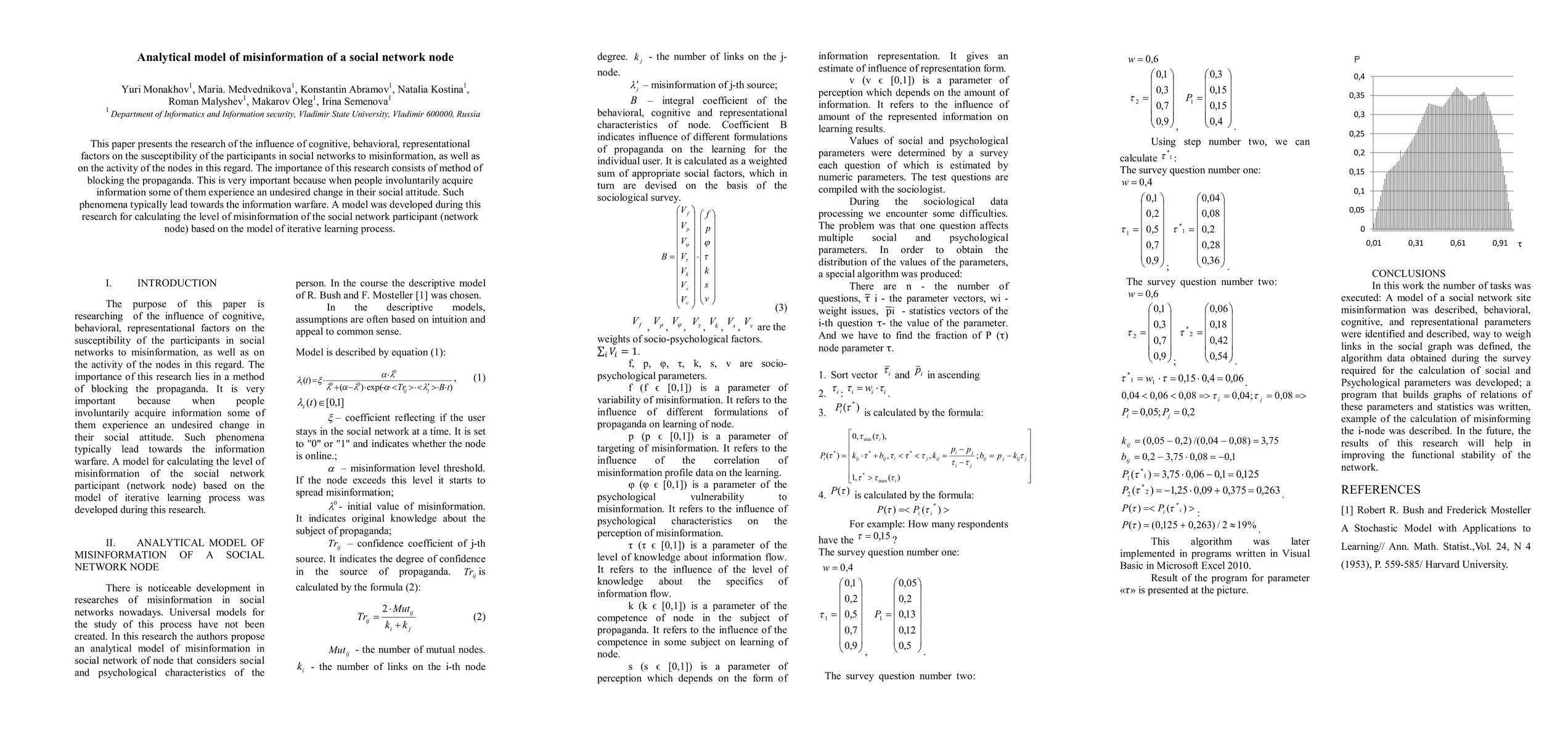 This paper presents the research of the influence of cognitive, behavioral, representational factors on the susceptibility of the participants in social networks to misinformation, as well as on the activity of the nodes in this regard. The importance of this research consists of method of blocking the propaganda. This is very important because when people involuntarily acquire information some of them experience an undesired change in their social attitude. Such phenomena typically lead towards the information warfare. A model was developed during this research for calculating the level of misinformation of the social network participant (network node) based on the model of iterative learning process.