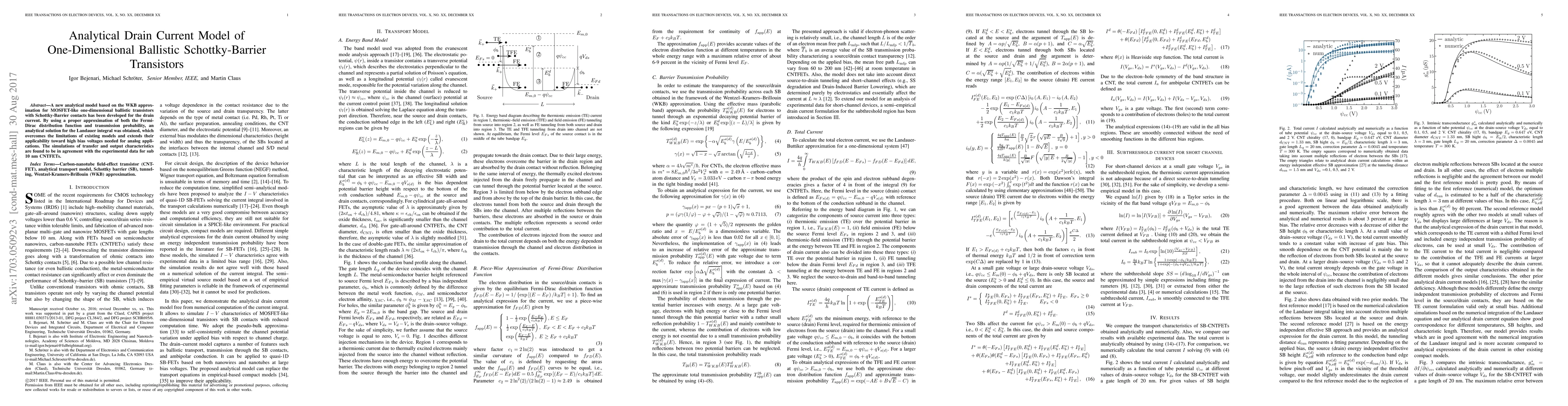This paper presents an analytical model for one-dimensional ballistic Schottky-Barrier transistors using the WKB approximation, providing an accurate solution for drain current under high bias voltages. The model's predictions match experimental data for sub-10-nm CNTFETs, enhancing its applicability for analog applications.