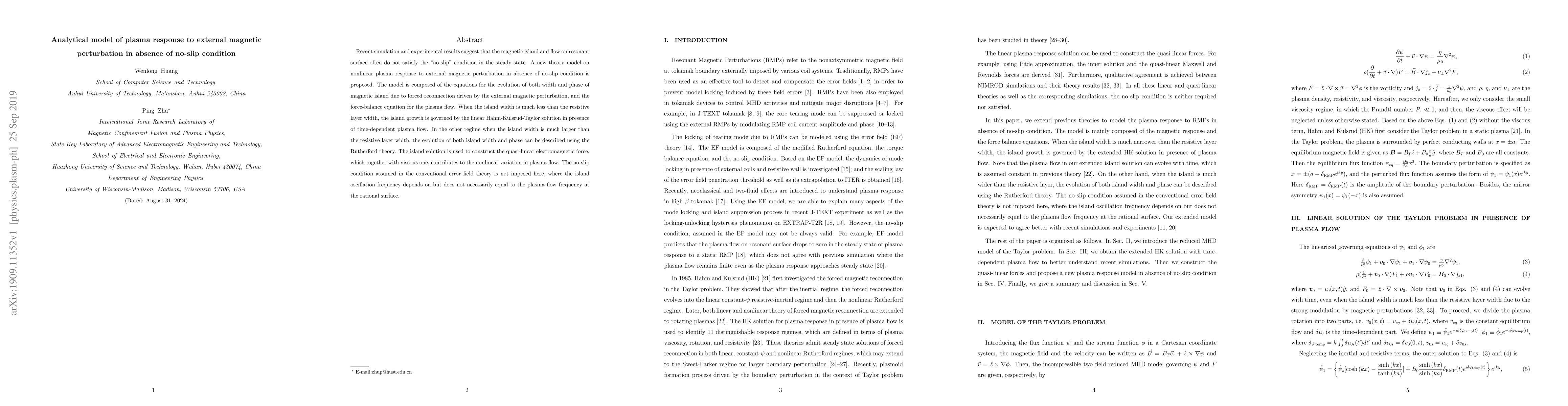 This paper proposes a new theoretical model for plasma response to external magnetic perturbations when the no-slip condition is absent. The model describes the evolution of magnetic island width and phase due to forced reconnection and includes a force-balance equation for plasma flow, showing that island oscillation frequency may differ from plasma flow frequency.