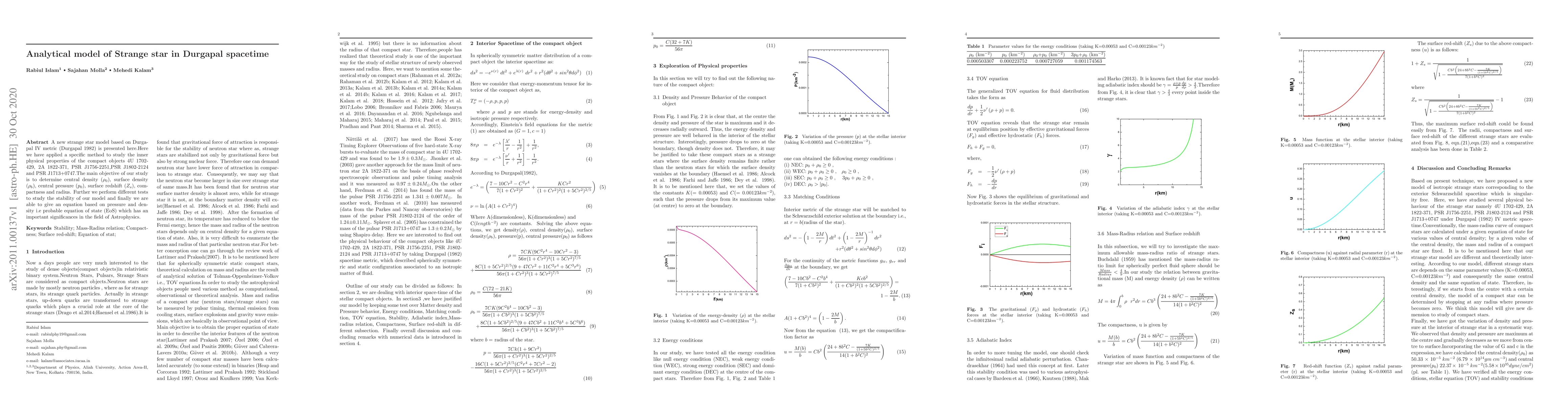 A new strange star model based on Durgapal IV metric (Durgapal 1982) is presented here.Here we have applied a specific method to study the inner physical properties of the compact objects 4U 1702-429, 2A 1822-371, PSR J1756-2251,PSR J1802-2124 and PSR J1713+0747.The main objective of our study is to determine central density ($\rho_{0}$), surface density ($\rho_{b}$), central pressure ($p_{0}$), surface redshift ($Z_{s}$), compactness and radius. Further we perform different tests to study the stability of our model and finally we are able to give an equation based on pressure and density i.e probable equation of state (EoS) which has an important significances in the field of Astrophysics.