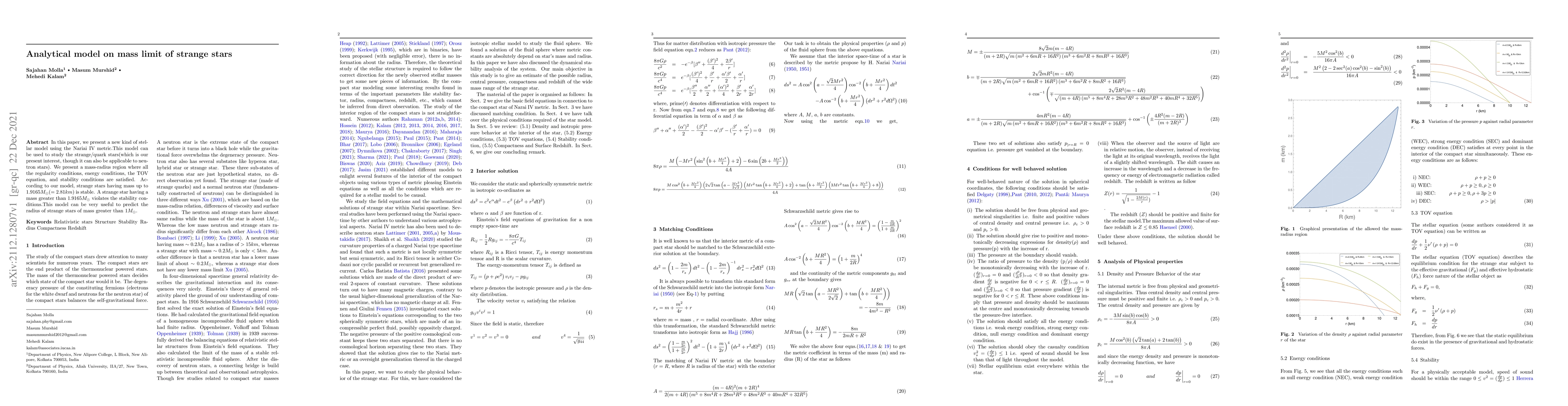 This paper introduces a new stellar model based on the Nariai IV metric to study strange/quark stars, showing that stable strange stars have a maximum mass of $1.9165M_{\odot}$ and a radius of $2.81$ km, beyond which stability is violated. The model also predicts the radius for stars exceeding $1 M_{\odot}$.
