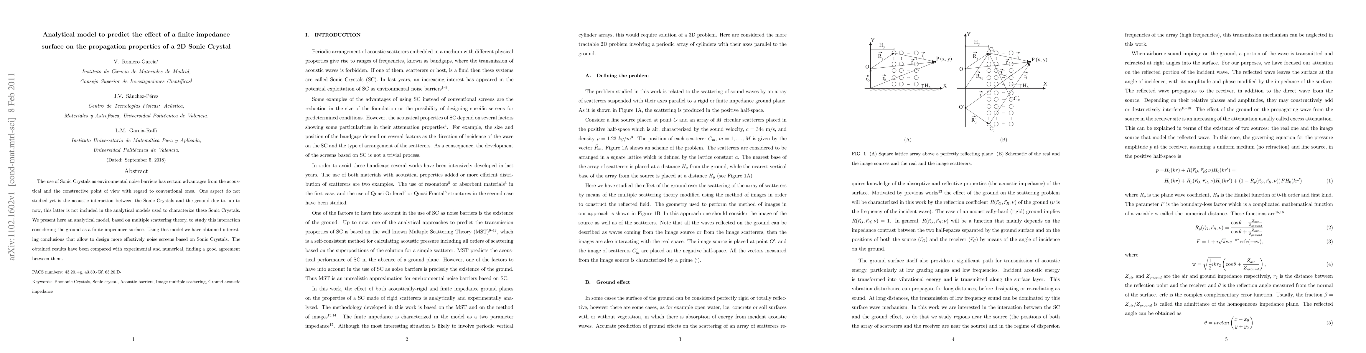 This paper introduces an analytical model based on multiple scattering theory to predict how a finite impedance surface (like the ground) affects the propagation properties of a 2D Sonic Crystal. The results provide valuable insights for designing more effective noise barriers using Sonic Crystals and show good agreement with experimental and numerical data.