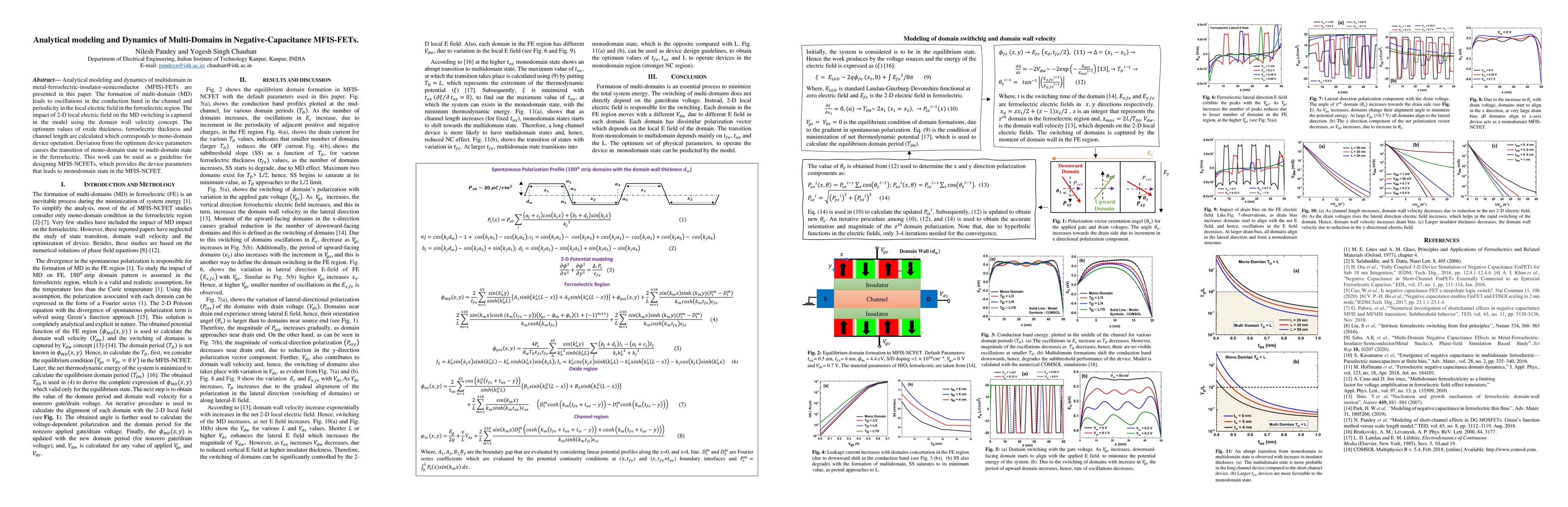 Analytical modeling and dynamics of multidomain in metal-ferroelectric-insulator-semiconductor (MFIS)-FETs are presented in this paper. The formation of multi-domain (MD) leads to oscillations in the conduction band in the channel and periodicity in the local electric field in the ferroelectric region. The impact of 2-D local electric field on the MD switching is captured in the model using the domain wall velocity concept. The optimum values of oxide thickness, ferroelectric thickness and channel length are calculated which corresponds to mono-domain device operation. Deviation from the optimum device parameters causes the transition of mono-domain state to multi-domain state in the ferroelectric. This work can be used as a guideline for designing MFIS-NCFETs, which provides the device parameters that leads to monodomain state in the MFIS-NCFET.