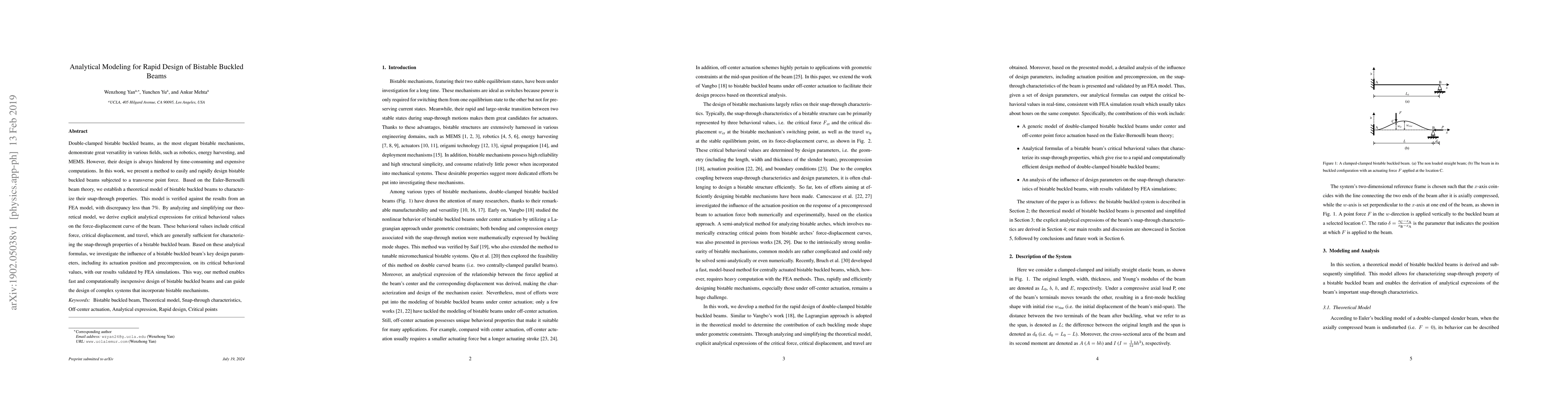 This paper introduces an analytical modeling method for rapidly designing bistable buckled beams, simplifying the Euler-Bernoulli beam theory to derive explicit formulas for critical force, displacement, and travel. The method reduces computational costs and is validated by FEA simulations, enabling quick design of bistable mechanisms in robotics and other fields.