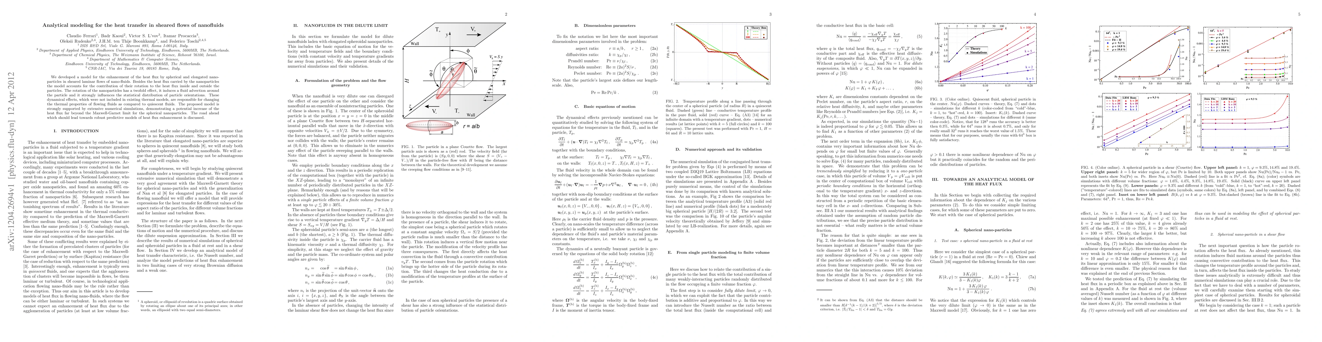 We developed a model for the enhancement of the heat flux by spherical and elongated nano- particles in sheared laminar flows of nano-fluids. Besides the heat flux carried by the nanoparticles the model accounts for the contribution of their rotation to the heat flux inside and outside the particles. The rotation of the nanoparticles has a twofold effect, it induces a fluid advection around the particle and it strongly influences the statistical distribution of particle orientations. These dynamical effects, which were not included in existing thermal models, are responsible for changing the thermal properties of flowing fluids as compared to quiescent fluids. The proposed model is strongly supported by extensive numerical simulations, demonstrating a potential increase of the heat flux far beyond the Maxwell-Garnet limit for the spherical nanoparticles. The road ahead which should lead towards robust predictive models of heat flux enhancement is discussed.