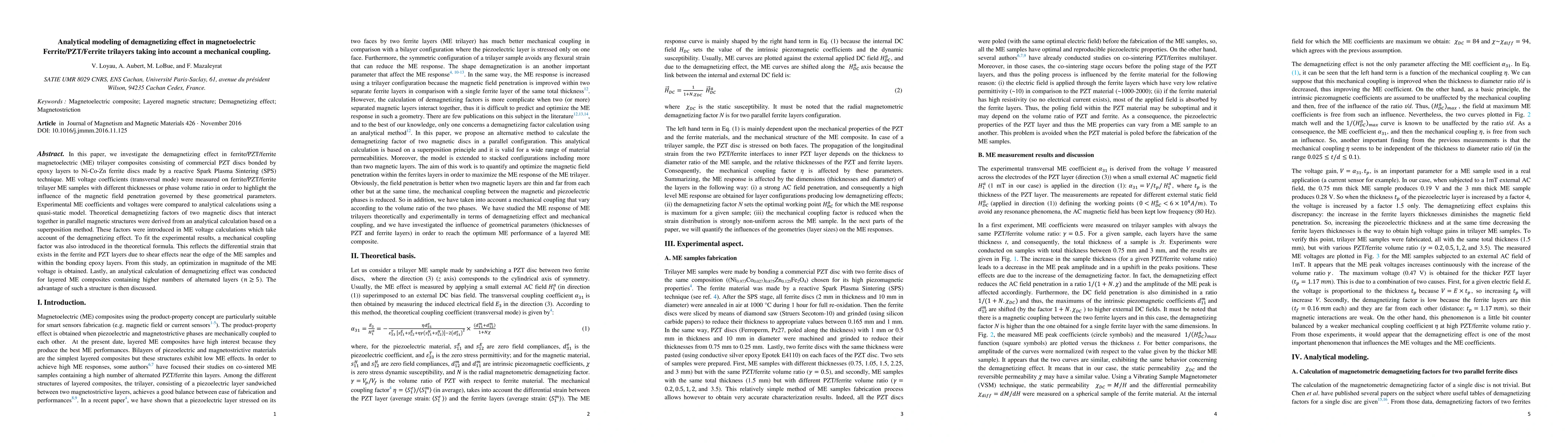In this paper, we investigate the demagnetizing effect in ferrite/PZT/ferrite magnetoelectric (ME) trilayer composites consisting of commercial PZT discs bonded by epoxy layers to Ni-Co-Zn ferrite discs made by a reactive Spark Plasma Sintering (SPS) technique. ME voltage coefficients (transversal mode) were measured on ferrite/PZT/ferrite trilayer ME samples with different thicknesses or phase volume ratio in order to highlight the influence of the magnetic field penetration governed by these geometrical parameters. Experimental ME coefficients and voltages were compared to analytical calculations using a quasi-static model. Theoretical demagnetizing factors of two magnetic discs that interact together in parallel magnetic structures were derived from an analytical calculation based on a superposition method. These factors were introduced in ME voltage calculations which take account of the demagnetizing effect. To fit the experimental results, a mechanical coupling factor was also introduced in the theoretical formula. This reflects the differential strain that exists in the ferrite and PZT layers due to shear effects near the edge of the ME samples and within the bonding epoxy layers. From this study, an optimization in magnitude of the ME voltage is obtained. Lastly, an analytical calculation of demagnetizing effect was conducted for layered ME composites containing higher numbers of alternated layers (). The advantage of such a structure is then discussed.