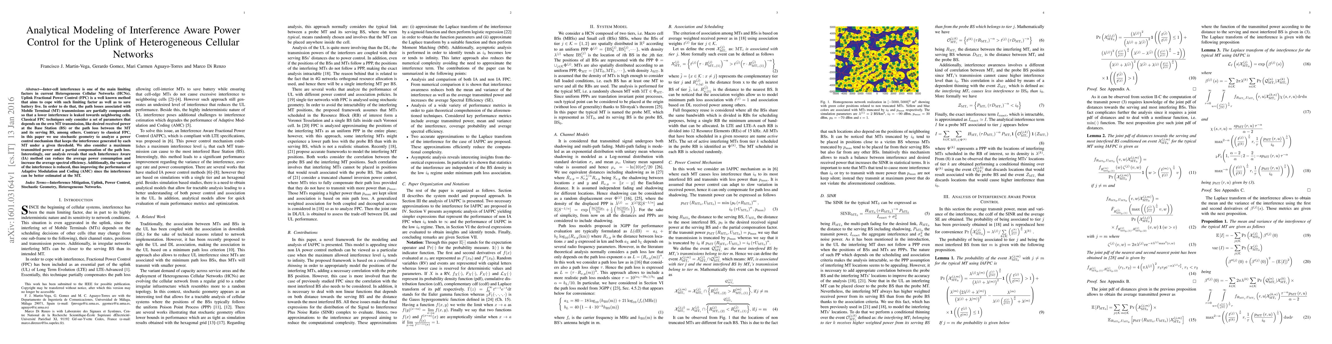 Inter-cell interference is one of the main limiting factors in current Heterogeneous Cellular Networks (HCNs). Uplink Fractional Power Control (FPC) is a well known method that aims to cope with such limiting factor as well as to save battery live. In order to do that, the path losses associated with Mobile Terminal (MT) transmissions are partially compensated so that a lower interference is leaked towards neighboring cells. Classical FPC techniques only consider a set of parameters that depends on the own MT transmission, like desired received power at the Base Station (BS) or the path loss between the MT and its serving BS, among others. Contrary to classical FPC, in this paper we use stochastic geometry to analyze a power control mechanism that keeps the interference generated by each MT under a given threshold. We also consider a maximum transmitted power and a partial compensation of the path loss. Interestingly, our analysis reveals that such Interference Aware (IA) method can reduce the average power consumption and increase the average spectral efficiency. Additionally, the variance of the interference is reduced, thus improving the performance of Adaptive Modulation and Coding (AMC) since the interference can be better estimated at the MT.
