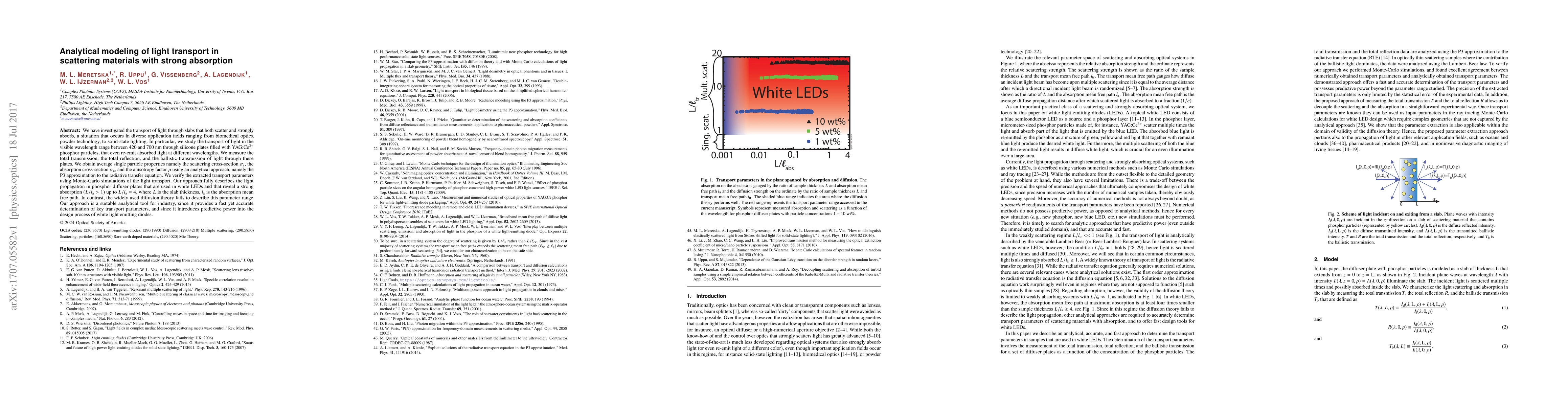 This paper investigates light transport in scattering and strongly absorbing materials, specifically silicone plates with YAG:Ce$^{3+}$ phosphor particles, using an analytical P3 approximation. The study measures and models key transport parameters, verifying them with Monte-Carlo simulations, and demonstrates the approach's effectiveness over diffusion theory for describing light propagation in phosphor diffuser plates used in white LEDs.
