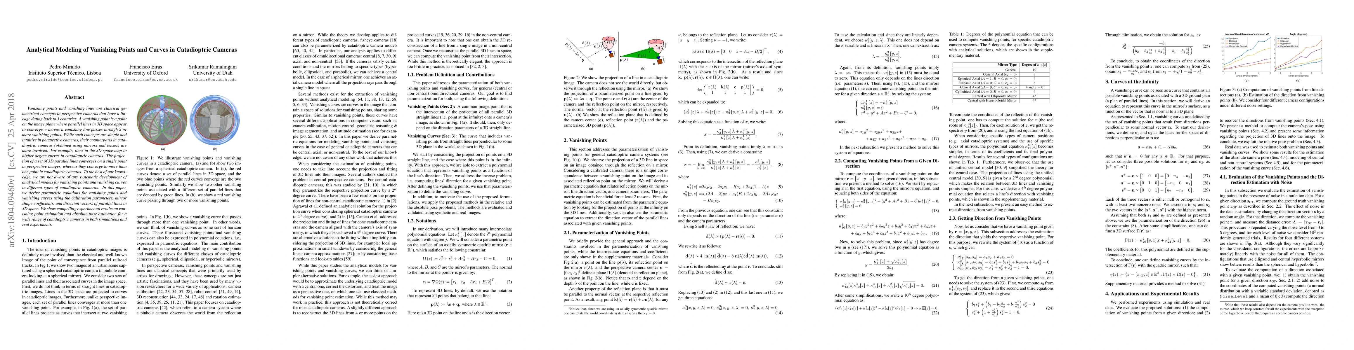 Vanishing points and vanishing lines are classical geometrical concepts in perspective cameras that have a lineage dating back to 3 centuries. A vanishing point is a point on the image plane where parallel lines in 3D space appear to converge, whereas a vanishing line passes through 2 or more vanishing points. While such concepts are simple and intuitive in perspective cameras, their counterparts in catadioptric cameras (obtained using mirrors and lenses) are more involved. For example, lines in the 3D space map to higher degree curves in catadioptric cameras. The projection of a set of 3D parallel lines converges on a single point in perspective images, whereas they converge to more than one point in catadioptric cameras. To the best of our knowledge, we are not aware of any systematic development of analytical models for vanishing points and vanishing curves in different types of catadioptric cameras. In this paper, we derive parametric equations for vanishing points and vanishing curves using the calibration parameters, mirror shape coefficients, and direction vectors of parallel lines in 3D space. We show compelling experimental results on vanishing point estimation and absolute pose estimation for a wide range of catadioptric cameras in both simulations and real experiments.