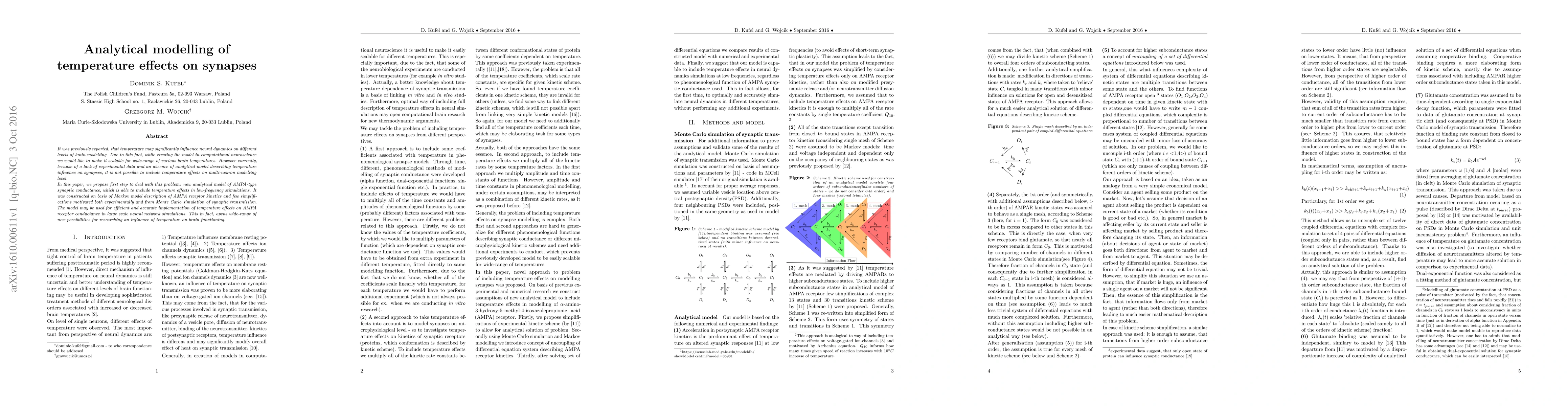 It was previously reported, that temperature may significantly influence neural dynamics on different levels of brain modelling. Due to this fact, while creating the model in computational neuroscience we would like to make it scalable for wide-range of various brain temperatures. However currently, because of a lack of experimental data and an absence of analytical model describing temperature influence on synapses, it is not possible to include temperature effects on multi-neuron modelling level. In this paper, we propose first step to deal with this problem: new analytical model of AMPA-type synaptic conductance, which is able to include temperature effects in low-frequency stimulations. It was constructed on basis of Markov model description of AMPA receptor kinetics and few simplifications motivated both experimentally and from Monte Carlo simulation of synaptic transmission. The model may be used for efficient and accurate implementation of temperature effects on AMPA receptor conductance in large scale neural network simulations. This in fact, opens wide-range of new possibilities for researching an influence of temperature on brain functioning.