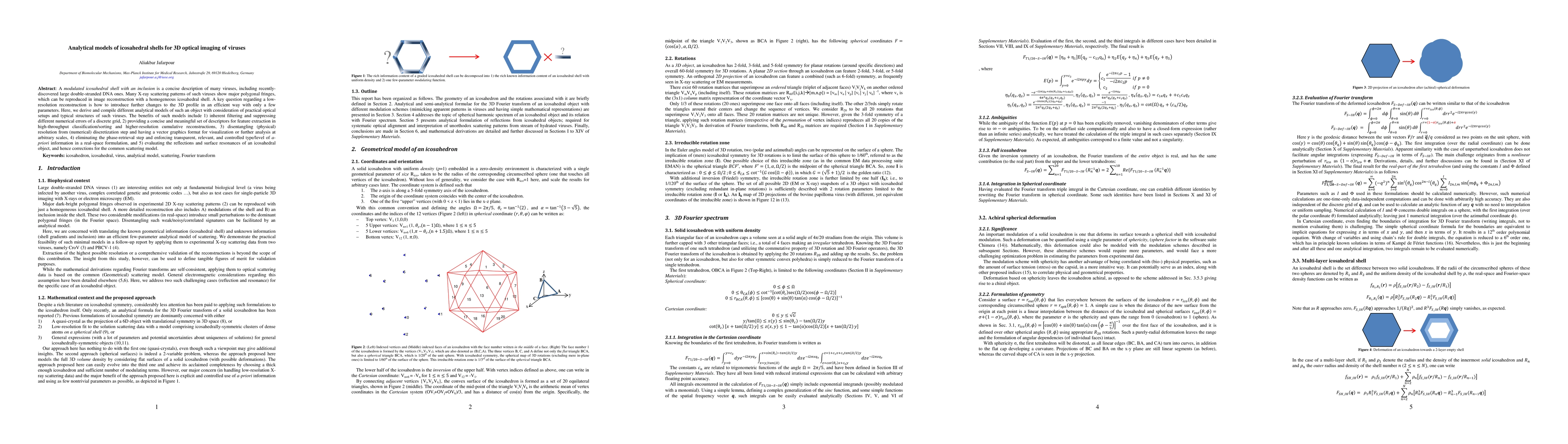 This paper develops analytical models for icosahedral virus shells to enhance 3D optical imaging reconstructions, focusing on minimizing numerical errors and facilitating high-throughput classification. The models offer benefits such as inherent filtering, concise feature extraction, and eliminating phase-retrieval steps, while also evaluating surface resonances for improved scattering models.