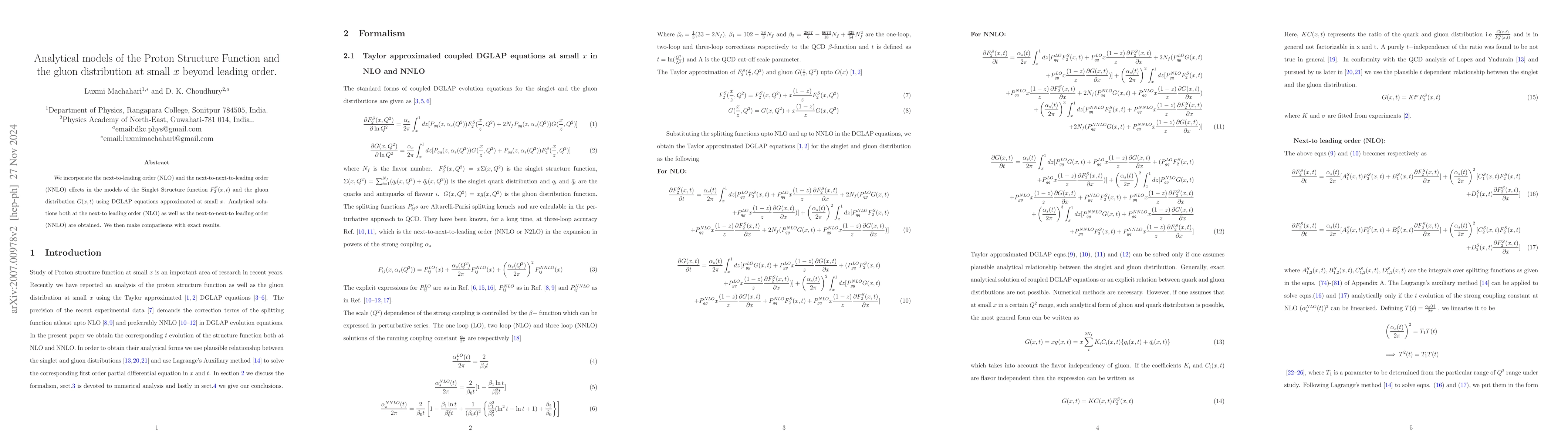 This paper develops analytical models for the proton structure function and gluon distribution at small x, incorporating next-to-leading and next-to-next-to-leading order effects using DGLAP equations. The study provides analytical solutions at both NLO and NNLO and compares them with exact results.