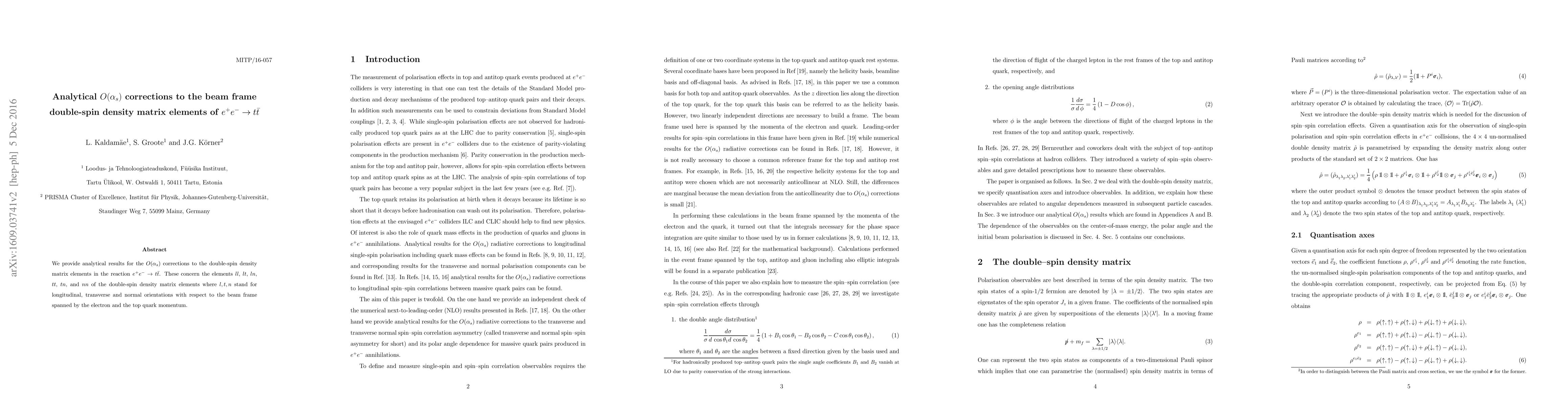 This paper presents analytical results for the $O(\alpha_s)$ corrections to the double-spin density matrix elements in the $e^+e^-\to t\bar t$ reaction, focusing on the $ll$, $lt$, $ln$, $tt$, $tn$, and $nn$ components, which describe the orientations relative to the beam frame.