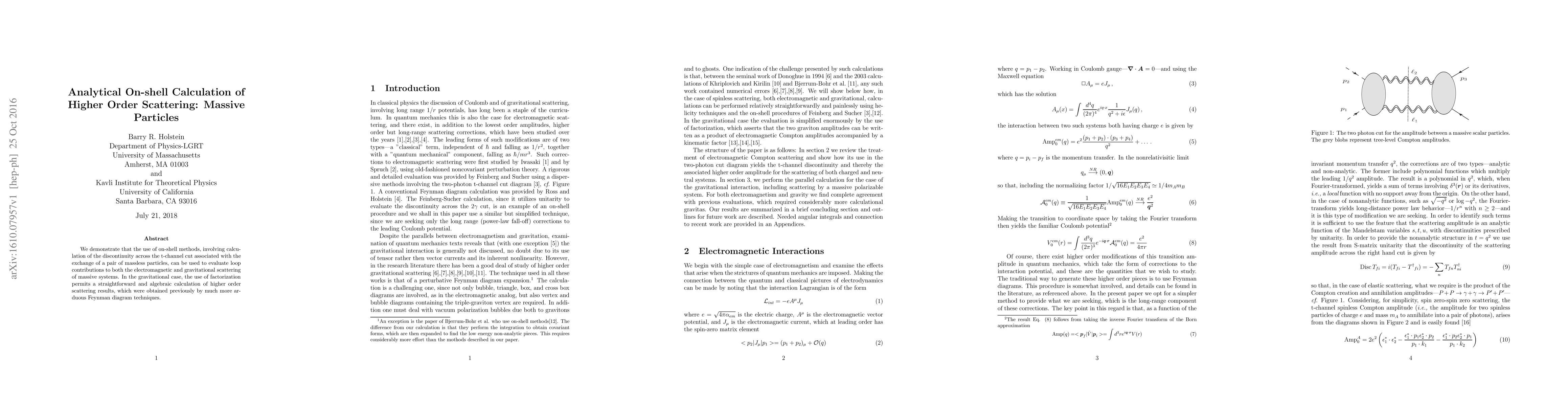 We demonstrate that the use of on-shell methods, involving calculation of the discontinuity across the t-channel cut associated with the exchange of a pair of massless particles, can be used to evaluate loop contributions to both the electromagnetic and gravitational scattering of massive systems. In the gravitational case, the use of factorization permits a straightforward and algebraic calculation of higher order scattering results, which were obtained previously by much more arduous Feynman diagram techniques.