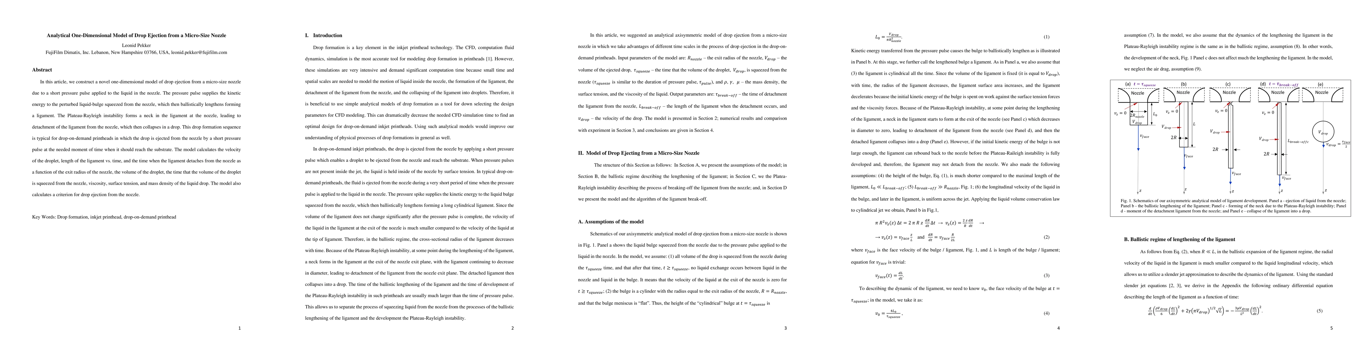 This paper develops a one-dimensional analytical model to describe drop ejection from micro-size nozzles under short pressure pulses, calculating the droplet velocity, ligament dynamics, and detachment time based on the nozzle's physical properties and fluid characteristics. The model also provides a criterion for successful drop ejection.