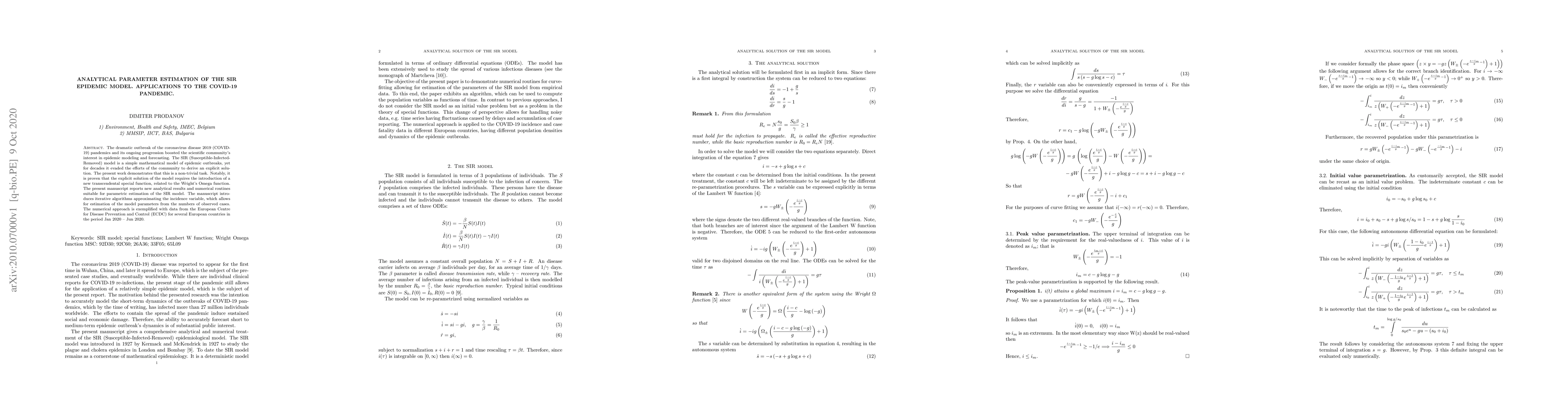 This paper presents new analytical and numerical methods for estimating parameters in the SIR epidemic model, introducing a novel transcendental function related to Wright's Omega function. It demonstrates the application of these methods to COVID-19 data from European countries, providing insights into the pandemic's progression.