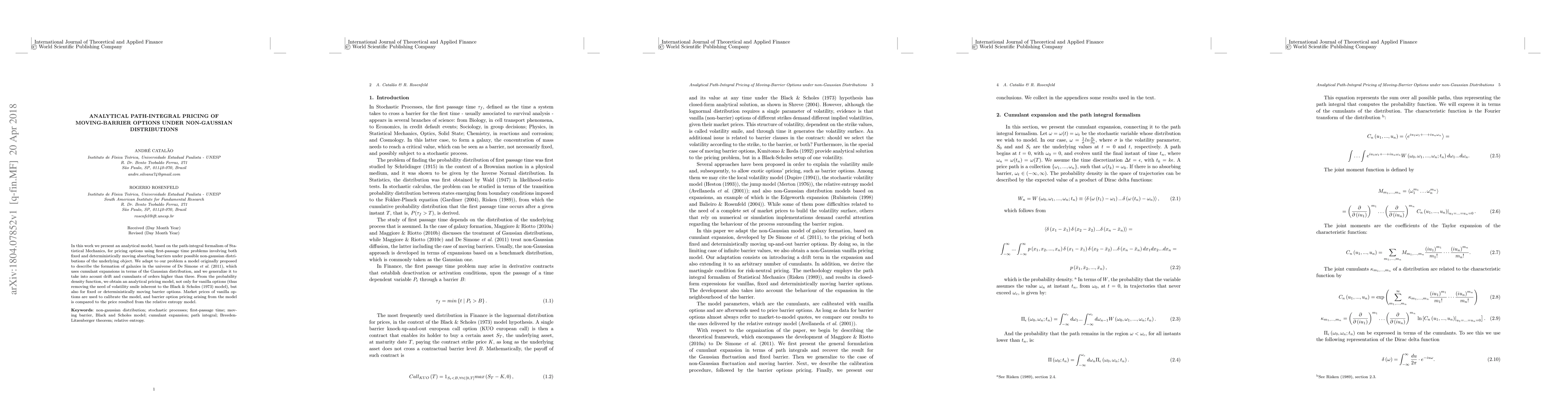 In this work we present an analytical model, based on the path-integral formalism of Statistical Mechanics, for pricing options using first-passage time problems involving both fixed and deterministically moving absorbing barriers under possible non-gaussian distributions of the underlying object. We adapt to our problem a model originally proposed to describe the formation of galaxies in the universe of De Simone et al (2011), which uses cumulant expansions in terms of the Gaussian distribution, and we generalize it to take into acount drift and cumulants of orders higher than three. From the probability density function, we obtain an analytical pricing model, not only for vanilla options (thus removing the need of volatility smile inherent to the Black-Scholes model), but also for fixed or deterministically moving barrier options. Market prices of vanilla options are used to calibrate the model, and barrier option pricing arising from the model is compared to the price resulted from the relative entropy model.