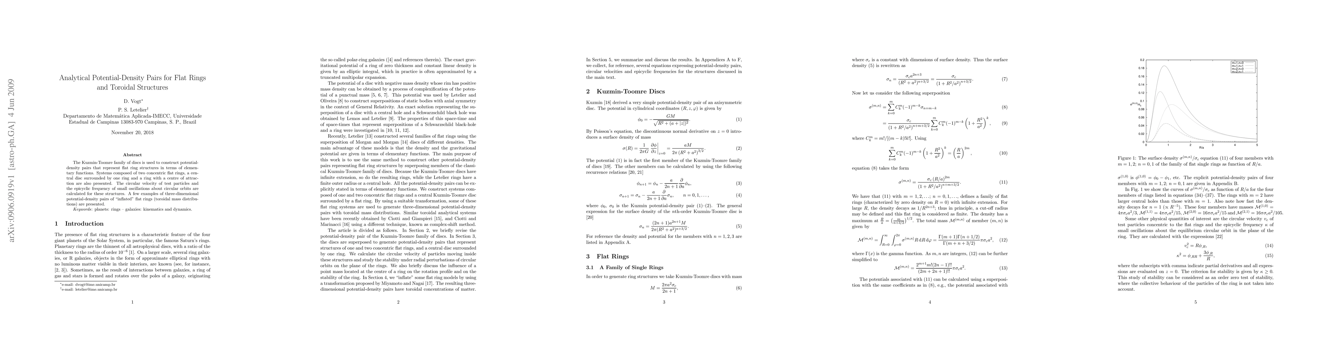 This paper constructs potential-density pairs for flat ring structures using the Kuzmin-Toomre family of discs, analyzing systems with concentric rings and calculating circular velocities and epicyclic frequencies. It also explores three-dimensional potential-density pairs for toroidal mass distributions.