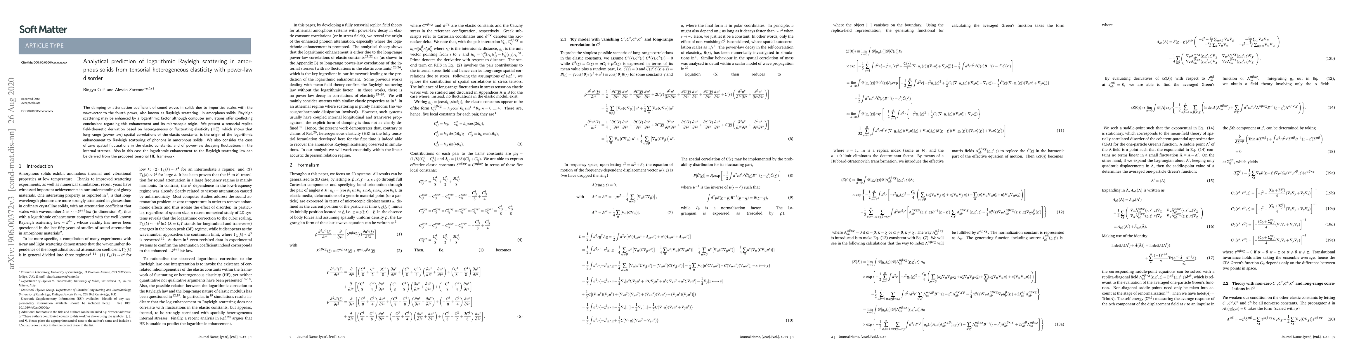 The damping or attenuation coefficient of sound waves in solids due to impurities scales with the wavevector to the fourth power, also known as Rayleigh scattering. In amorphous solids, Rayleigh scattering may be enhanced by a logarithmic factor although computer simulations offer conflicting conclusions regarding this enhancement and its microscopic origin. We present a tensorial replica field-theoretic derivation based on heterogeneous or fluctuating elasticity (HE), which shows that long-range (power-law) spatial correlations of the elastic constants, is the origin of the logarithmic enhancement to Rayleigh scattering of phonons in amorphous solids. We also consider the case of zero spatial fluctuations in the elastic constants, and of power-law decaying fluctuations in the internal stresses. Also in this case the logarithmic enhancement to the Rayleigh scattering law can be derived from the proposed tensorial HE framework.