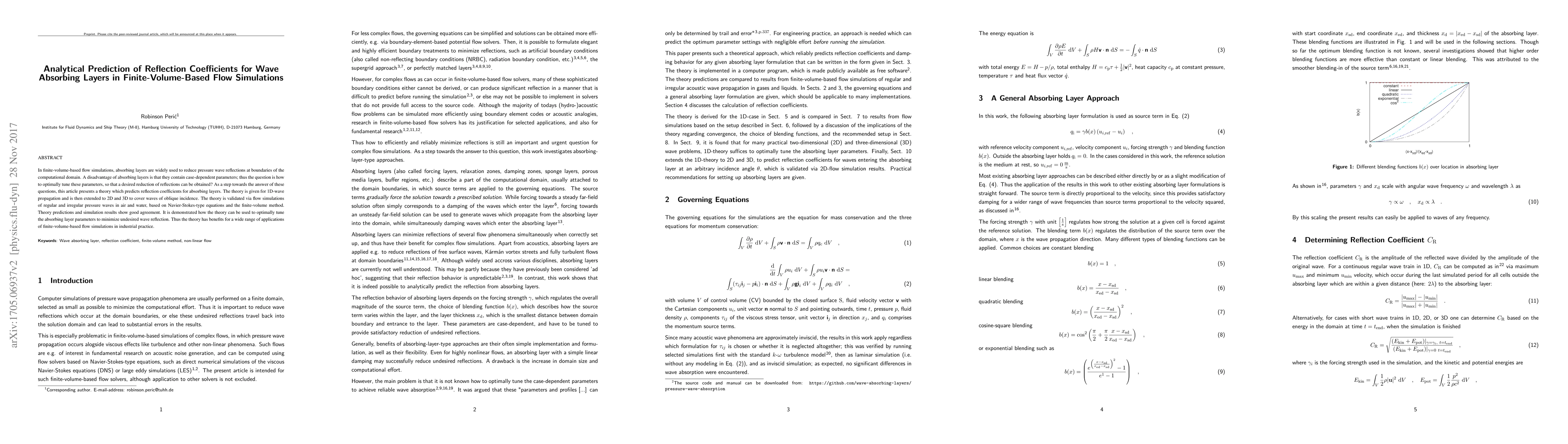 In finite-volume-based flow simulations, absorbing layers are widely used to reduce pressure wave reflections at boundaries of the computational domain. A disadvantage of absorbing layers is that they contain case-dependent parameters; thus the question is how to optimally tune these parameters, so that a desired reduction of reflections can be obtained? As a step towards the answer of these questions, this article presents a theory which predicts reflection coefficients for absorbing layers. The theory is given for 1D-wave propagation and is then extended to 2D and 3D to cover waves of oblique incidence. The theory is validated via flow simulations of regular and irregular pressure waves in air and water, based on Navier-Stokes-type equations and the finite-volume method. Theory predictions and simulation results show good agreement. It is demonstrated how the theory can be used to optimally tune the absorbing layer parameters to minimize undesired wave reflection. Thus the theory has benefits for a wide range of applications of finite-volume-based flow simulations in industrial practice.
