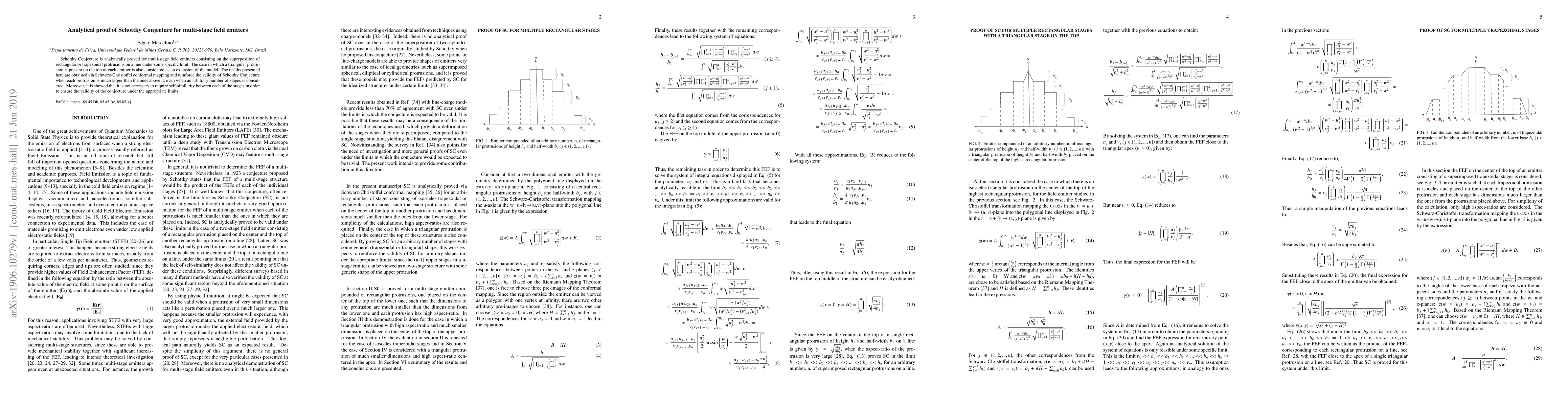 The paper analytically proves the Schottky Conjecture for multi-stage field emitters using Schwarz-Christoffel conformal mapping, showing validity even with non-self-similar protrusions. The model extends to emitters with triangular protrusions, reinforcing conjecture applicability under specific limits.