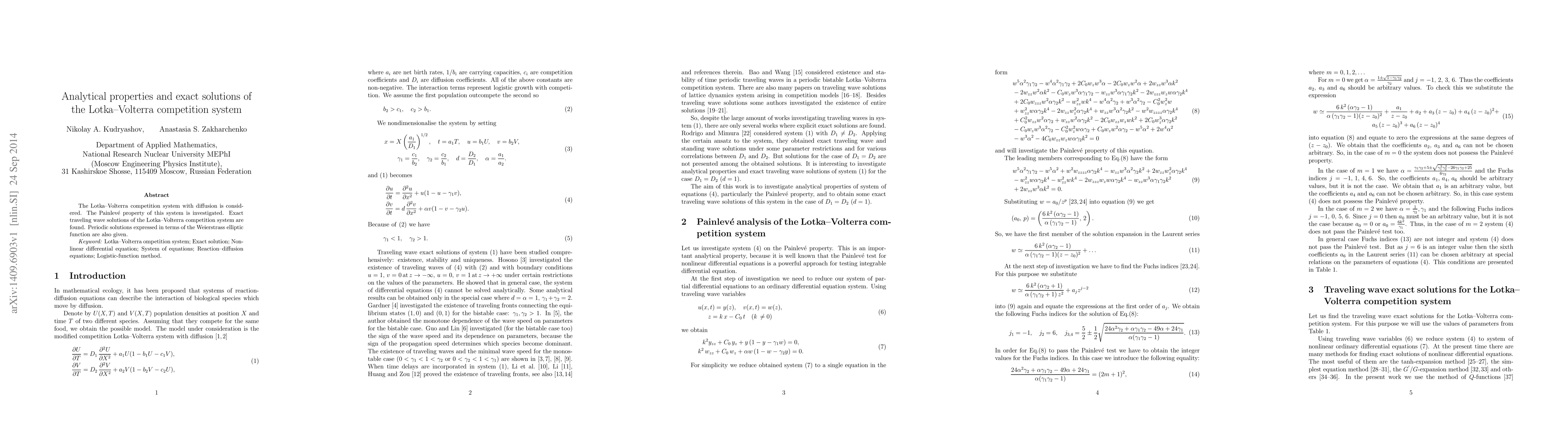 This paper investigates the analytical properties of the Lotka-Volterra competition system with diffusion, focusing on its Painlevé property. It presents exact traveling wave solutions and periodic solutions expressed using Weierstrass elliptic functions.