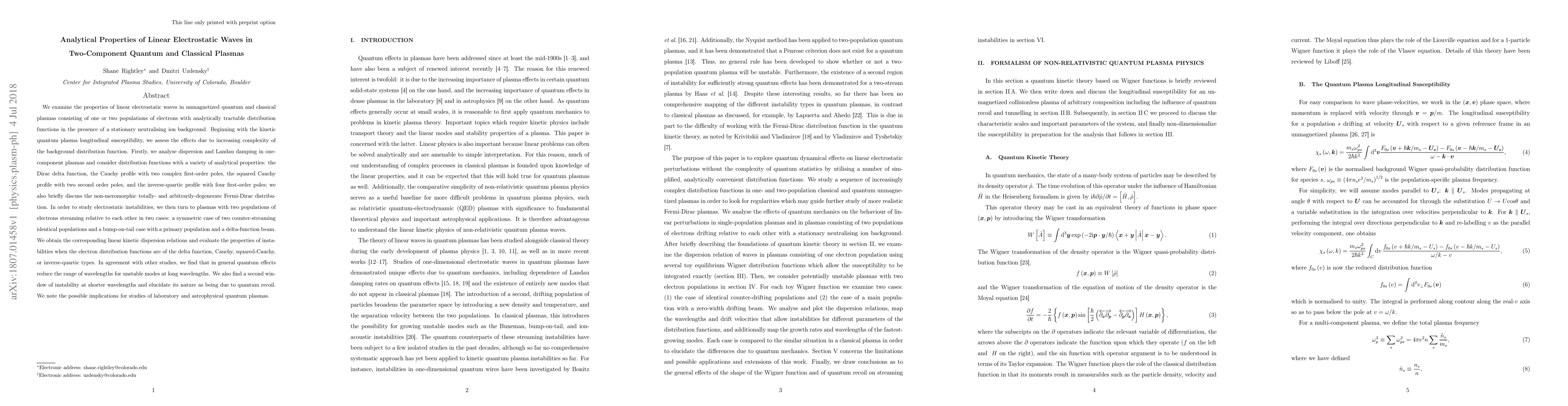 We examine the properties of linear electrostatic waves in unmagnetized quantum and classical plasmas consisting of one or two populations of electrons with analytically tractable distribution functions in the presence of a stationary neutralising ion background. Beginning with the kinetic quantum plasma longitudinal susceptibility, we assess the effects due to increasing complexity of the background distribution function. Firstly, we analyse dispersion and Landau damping in one-component plasmas and consider distribution functions with a variety of analytical properties: the Dirac delta function, the Cauchy profile with two complex first-order poles, the squared Cauchy profile with two second order poles, and the inverse-quartic profile with four first-order poles; we also briefly discuss the non-meromorphic totally- and arbitrarily-degenerate Fermi-Dirac distribution. In order to study electrostatic instabilities, we then turn to plasmas with two populations of electrons streaming relative to each other in two cases: a symmetric case of two counter-streaming identical populations and a bump-on-tail case with a primary population and a delta-function beam. We obtain the corresponding linear kinetic dispersion relations and evaluate the properties of instabilities when the electron distribution functions are of the delta function, Cauchy, squared-Cauchy, or inverse-quartic types. In agreement with other studies, we find that in general quantum effects reduce the range of wavelengths for unstable modes at long wavelengths. We also find a second window of instability at shorter wavelengths and elucidate its nature as being due to quantum recoil. We note the possible implications for studies of laboratory and astrophysical quantum plasmas.