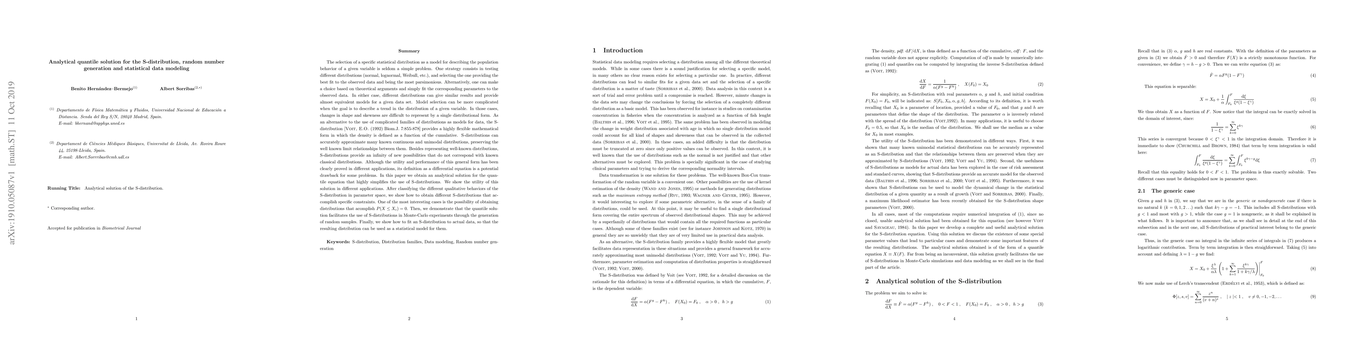 The selection of a specific statistical distribution is seldom a simple problem. One strategy consists in testing different distributions (normal, lognormal, Weibull, etc.), and selecting the one providing the best fit to the observed data and being the most parsimonious. Alternatively, one can make a choice based on theoretical arguments and simply fit the corresponding parameters to the observed data. In either case, different distributions can give similar results and provide almost equivalent results. Model selection can be more complicated when the goal is to describe a trend in the distribution of a given variable. In those cases, changes in shape and skewness are difficult to represent by a single distributional form. As an alternative to the use of complicated families of distributions as models for data, the S-distribution [{\sc Voit, E.O. }(1992) Biom.J. 7:855-878] provides a highly flexible mathematical form in which the density is defined as a function of the cumulative. Besides representing well-known distributions, S-distributions provide an infinity of new possibilities that do not correspond with known classical distributions. In this paper we obtain an analytical solution for the quantile equation that highly simplifies the use of S-distributions. We show the utility of this solution in different applications. After classifying the different qualitative behaviors of the S-distribution in parameter space, we show how to obtain different S-distributions that accomplish specific constraints. One interesting case is the possibility of obtaining distributions that acomplish P(X <= X_c)=0. Then, we show that the quantile solution facilitates the use of S-distributions in Monte-Carlo experiments through the generation of random samples. Finally, we show how to fit an S-distribution to actual data, so that the resulting distribution can be used as a statistical model for them.