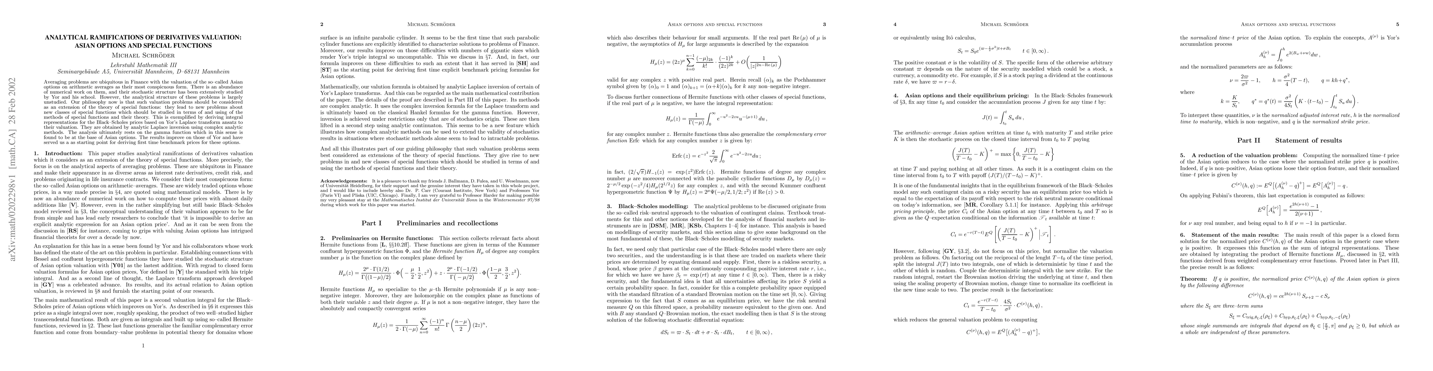 Averaging problems are ubiquitous in Finance with the valuation of the so-called Asian options on arithmetic averages as their most conspicuous form. There is an abundance of numerical work on them, and their stochastic structure has been extensively studied by Yor and his school. However, the analytical structure of these problems is largely unstudied. Our philosophy now is that such valuation problems should be considered as an extension of the theory of special functions: they lead to new problems about new classes of special functions which should be studied in terms of and using of the methods of special functions and their theory. This is exemplified by deriving integral representations for the Black-Scholes prices based on Yor's Laplace transform ansatz to their valuation. They are obtained by analytic Laplace inversion using complex analytic methods. The analysis ultimately rests on the gamma function which in this sense is found to be at the base of Asian options. The results improve on those of Yor and have served us a as starting point for deriving first time benchmark prices for these options.