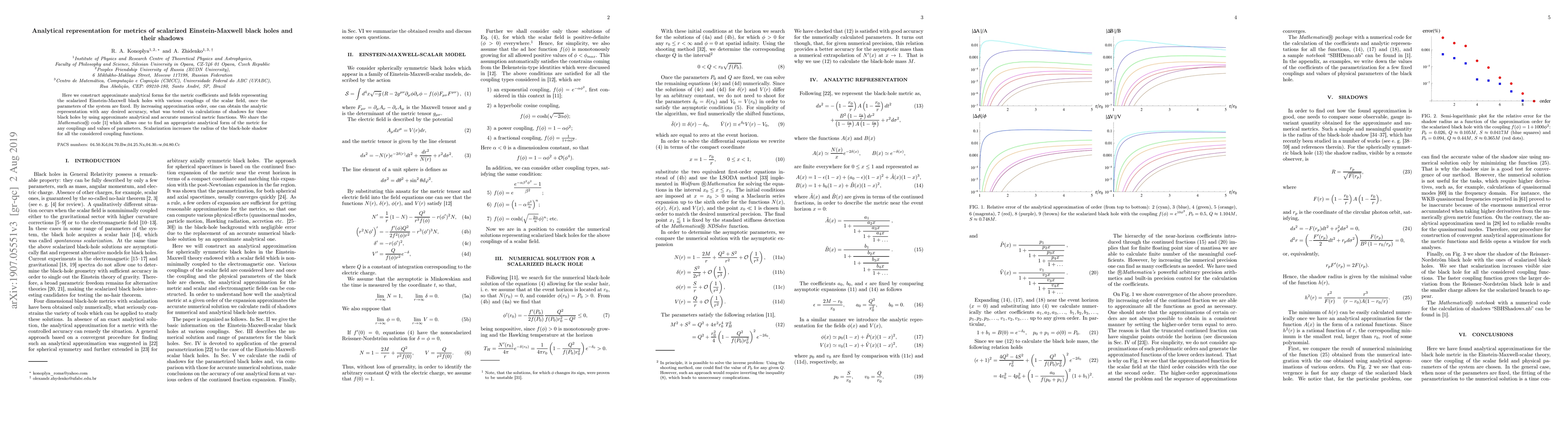 This paper develops analytical representations for scalarized Einstein-Maxwell black holes, providing approximate forms for metric coefficients and fields. The study shows that these approximations can achieve any desired accuracy, validated through shadow calculations, and includes Mathematica code for generating metric forms.