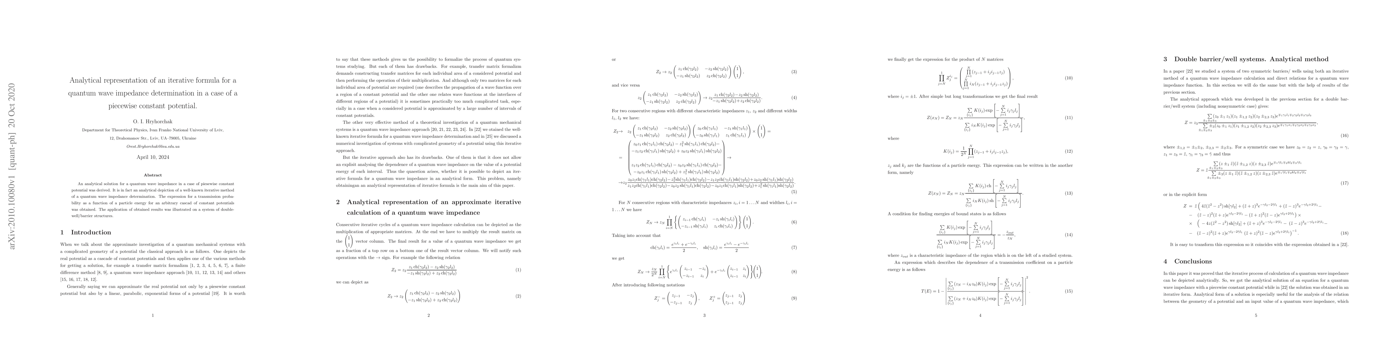 This paper derives an analytical solution for quantum wave impedance in piecewise constant potentials, representing an iterative method. It provides an expression for transmission probability as a function of particle energy for a series of constant potentials and applies these results to a double-well/barrier system.
