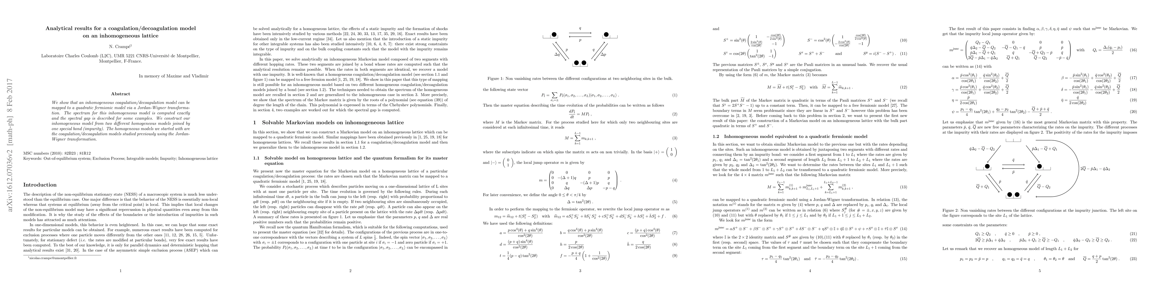 We show that an inhomogeneous coagulation/decoagulation model can be mapped to a quadratic fermionic model via a Jordan-Wigner transformation. The spectrum for this inhomogeneous model is computed exactly and the spectral gap is described for some examples. We construct our inhomogeneous model from two different homogeneous models joined by one special bond (impurity). The homogeneous models we started with are the coagulation/decoagulation models studied previously using the Jordan-Wigner transformation.