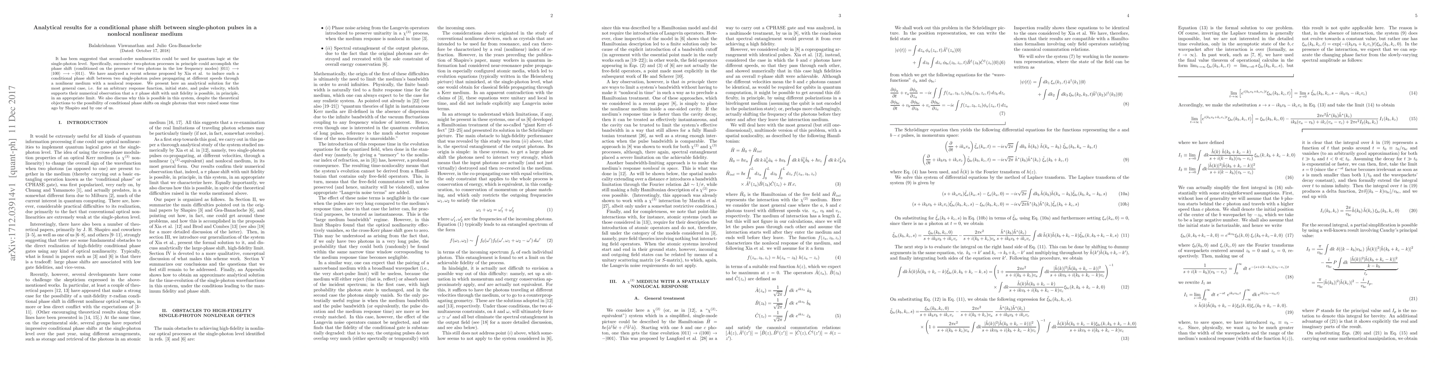 It has been suggested that second-order nonlinearities could be used for quantum logic at the single-photon level. Specifically, successive two-photon processes in principle could accomplish the phase shift (conditioned on the presence of two photons in the low frequency modes) $ |011 \rangle \longrightarrow i|100 \rangle \longrightarrow -|011 \rangle $. We have analyzed a recent scheme proposed by Xia et al. to induce such a conditional phase shift between two single-photon pulses propagating at different speeds through a nonlinear medium with a nonlocal response. We present here an analytical solution for the most general case, i.e. for an arbitrary response function, initial state, and pulse velocity, which supports their numerical observation that a $\pi$ phase shift with unit fidelity is possible, in principle, in an appropriate limit. We also discuss why this is possible in this system, despite the theoretical objections to the possibility of conditional phase shifts on single photons that were raised some time ago by Shapiro and by one of us.