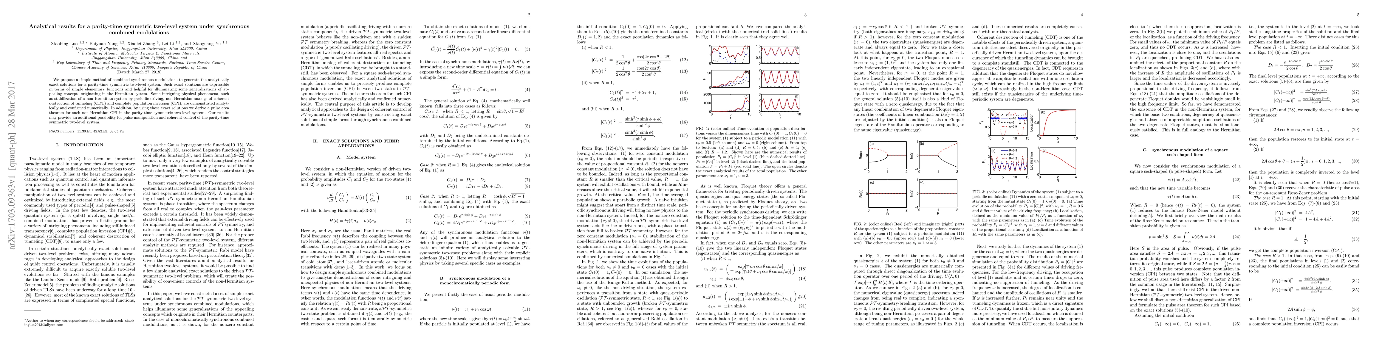 This paper proposes a method for generating analytically exact solutions for a parity-time symmetric two-level system using combined synchronous modulations. The solutions demonstrate phenomena like stabilization by periodic driving, non-Hermitian analogs of coherent destruction of tunneling, and complete population inversion, with a derived pulse area theorem for non-Hermitian complete population inversion.