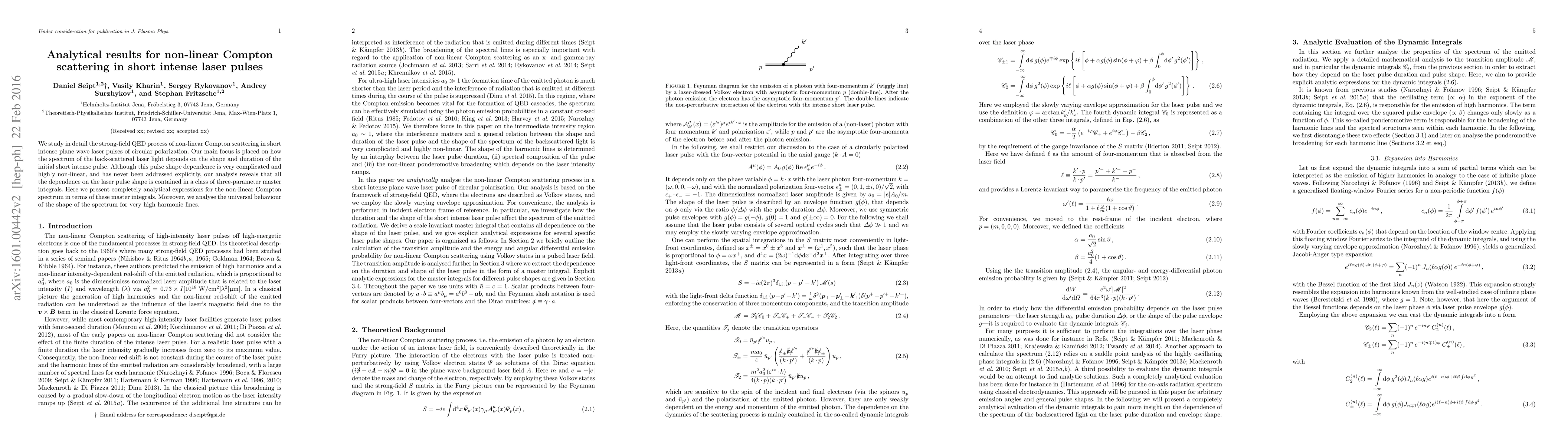 The paper presents a detailed analysis and completely analytical expressions for master integrals describing non-linear Compton scattering in short intense laser pulses, scaling out pulse duration dependence.
