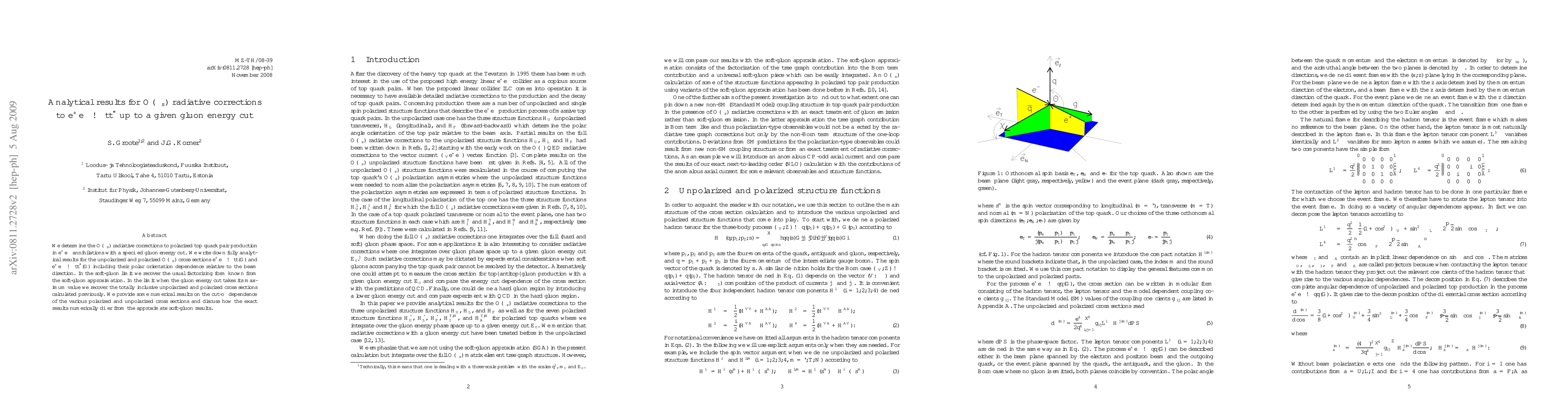 This paper presents fully analytical results for O(\alpha_s) radiative corrections in e+ e- annihilations producing polarized top quark pairs, with a specified gluon energy cut. It discusses the dependence on the gluon energy cut and compares exact results with the soft-gluon approximation.